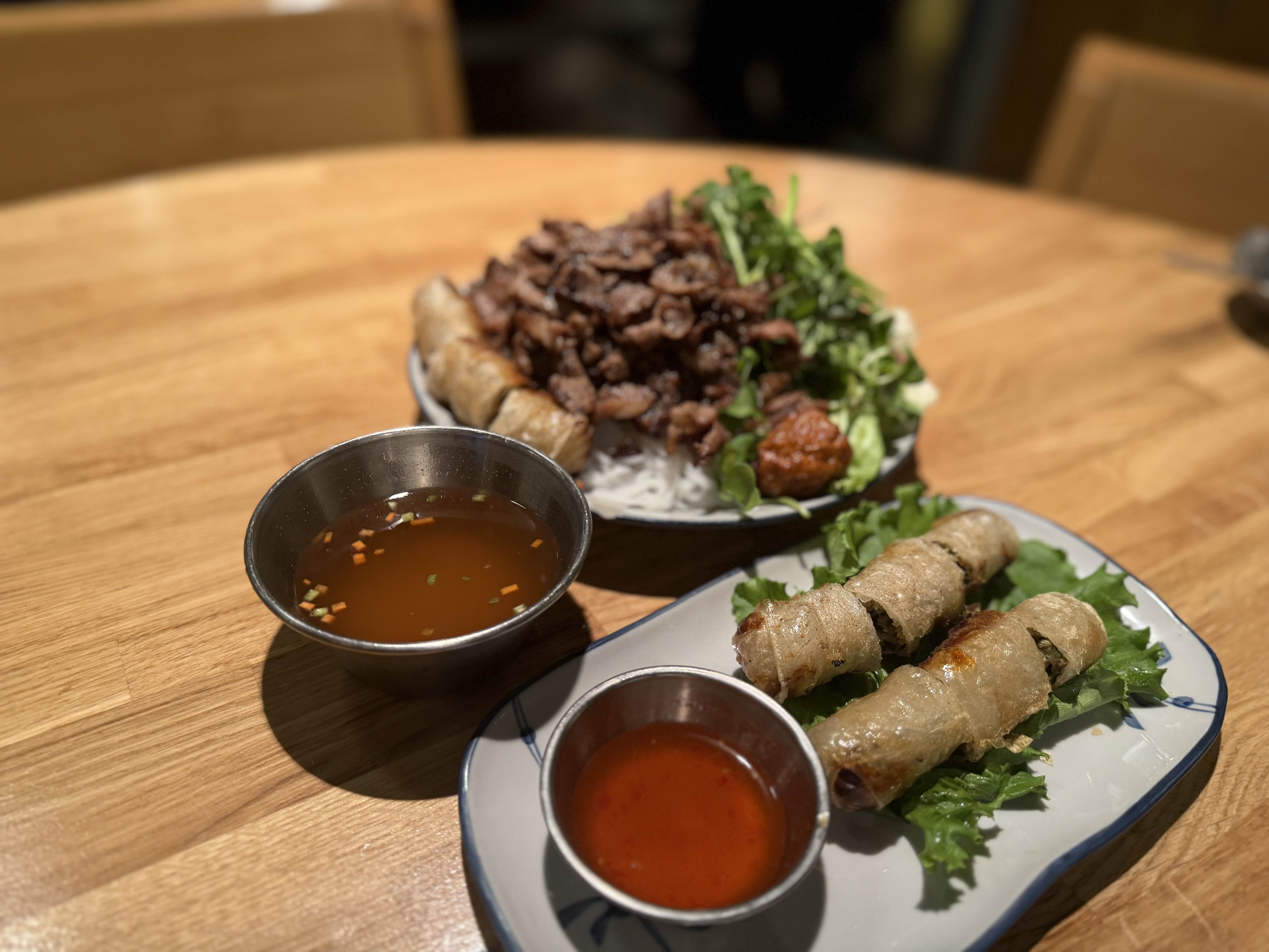 피쉬소스 베이스의 새콤달콤한 소스에 찍어먹으면 입 안 가득 베트남의 향기가 퍼진다. 숯불 돼지고기의 고소하고 진한 풍미가 매력적.