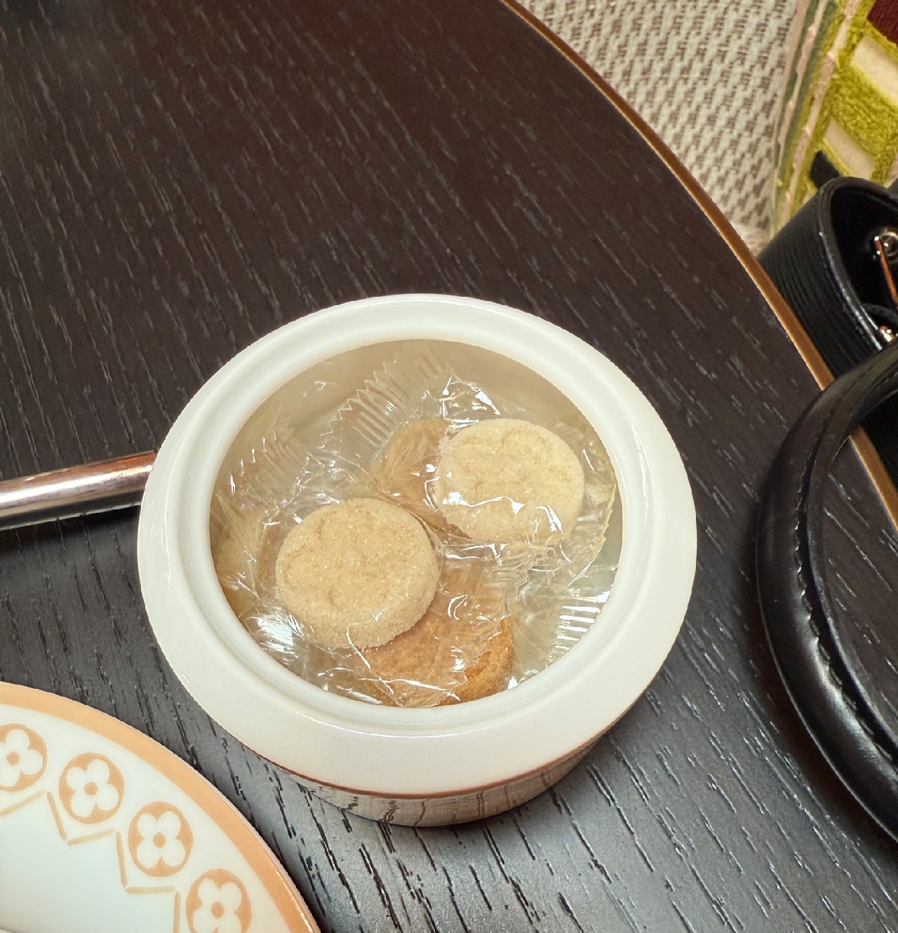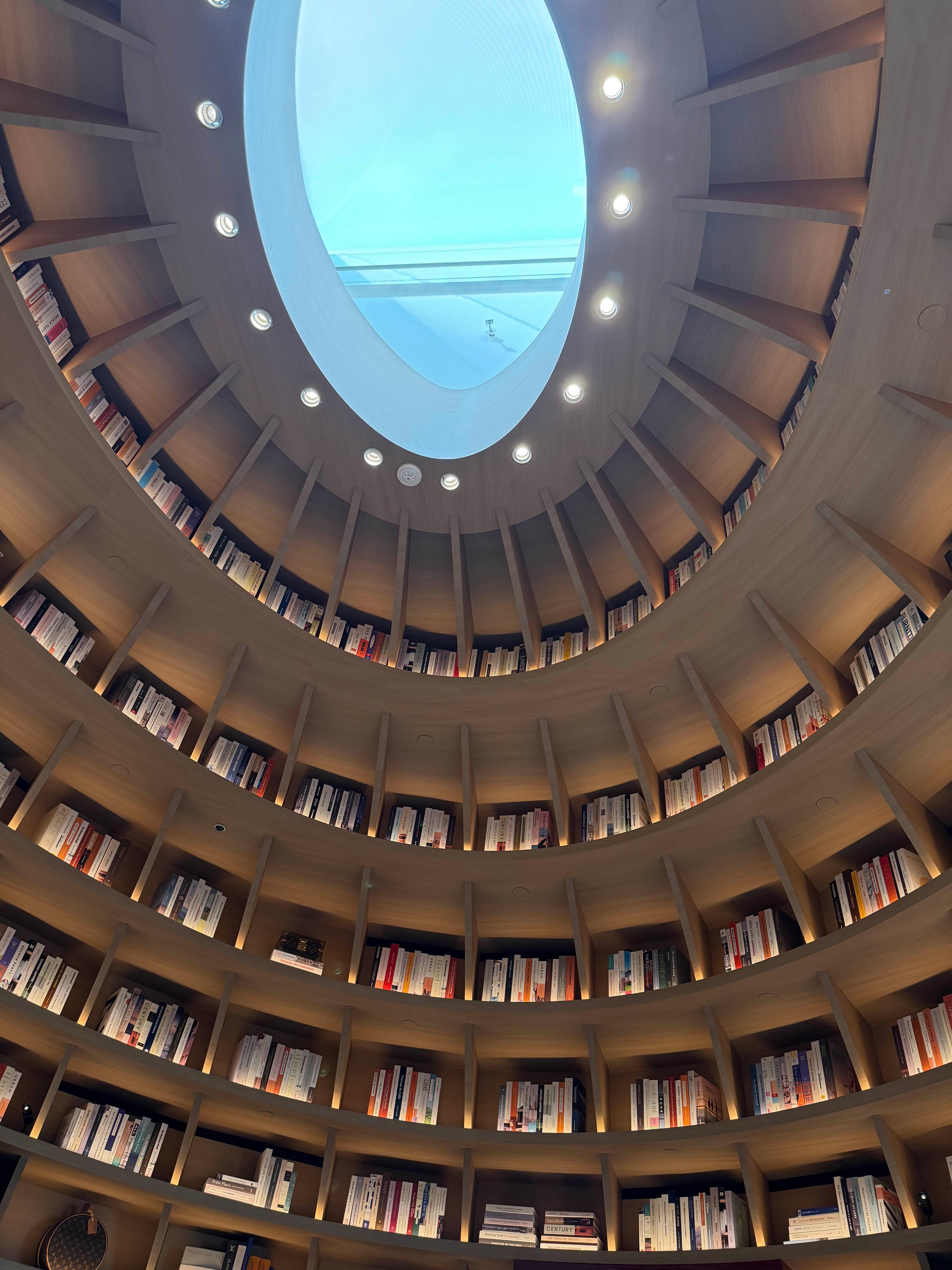 • 4층 카페는 사전 예약제로만 운영돼. 예약 시간 5분 전부터 입장할 수 있었고, 들어가자마자 도서관 같은 인테리어가 펼쳐져. 원형 서가와 오렌지 포인트 조명, 루이비통 문양이 가득한 테이블 세팅까지 고급스러움이 가득했어.
