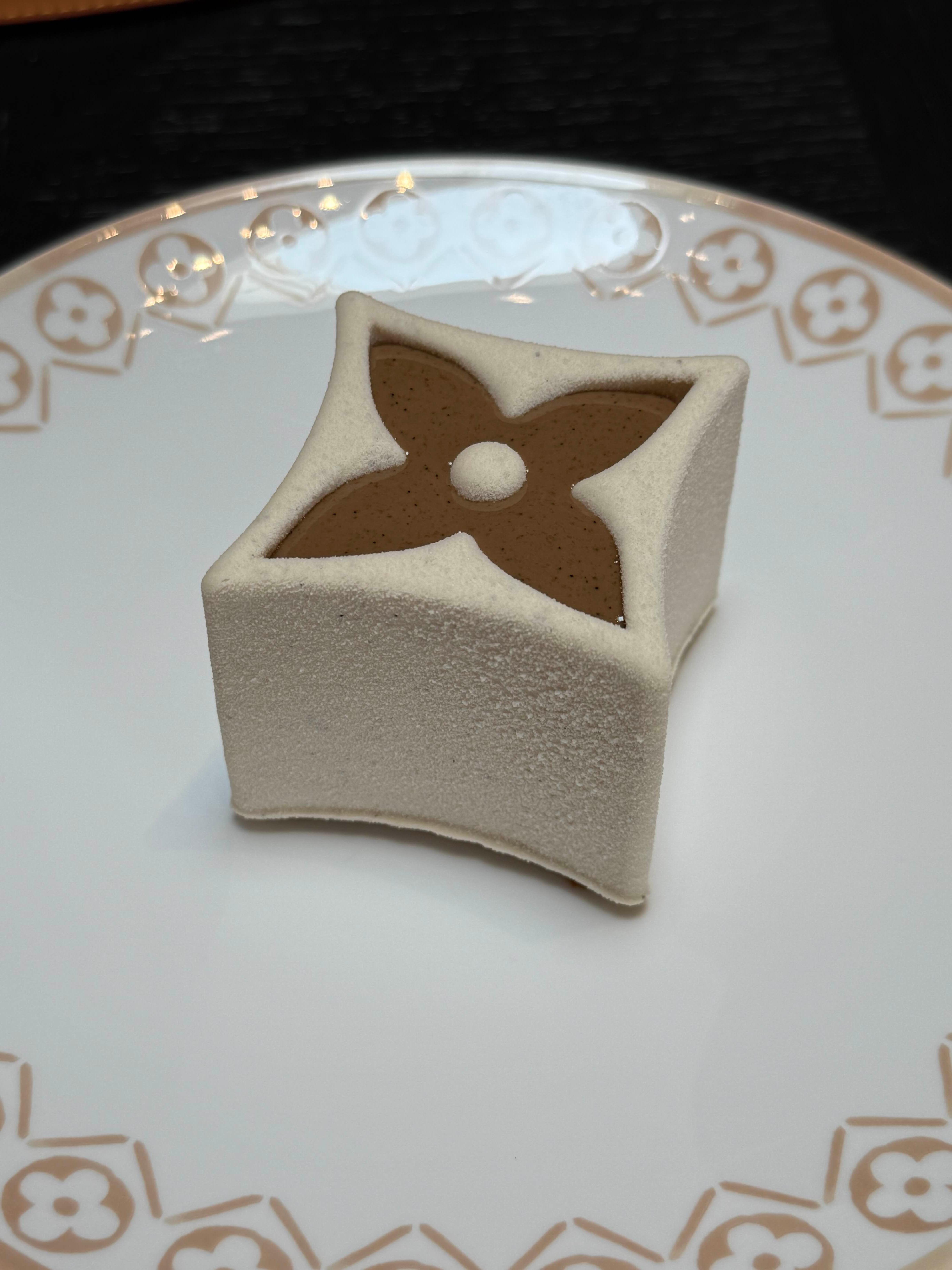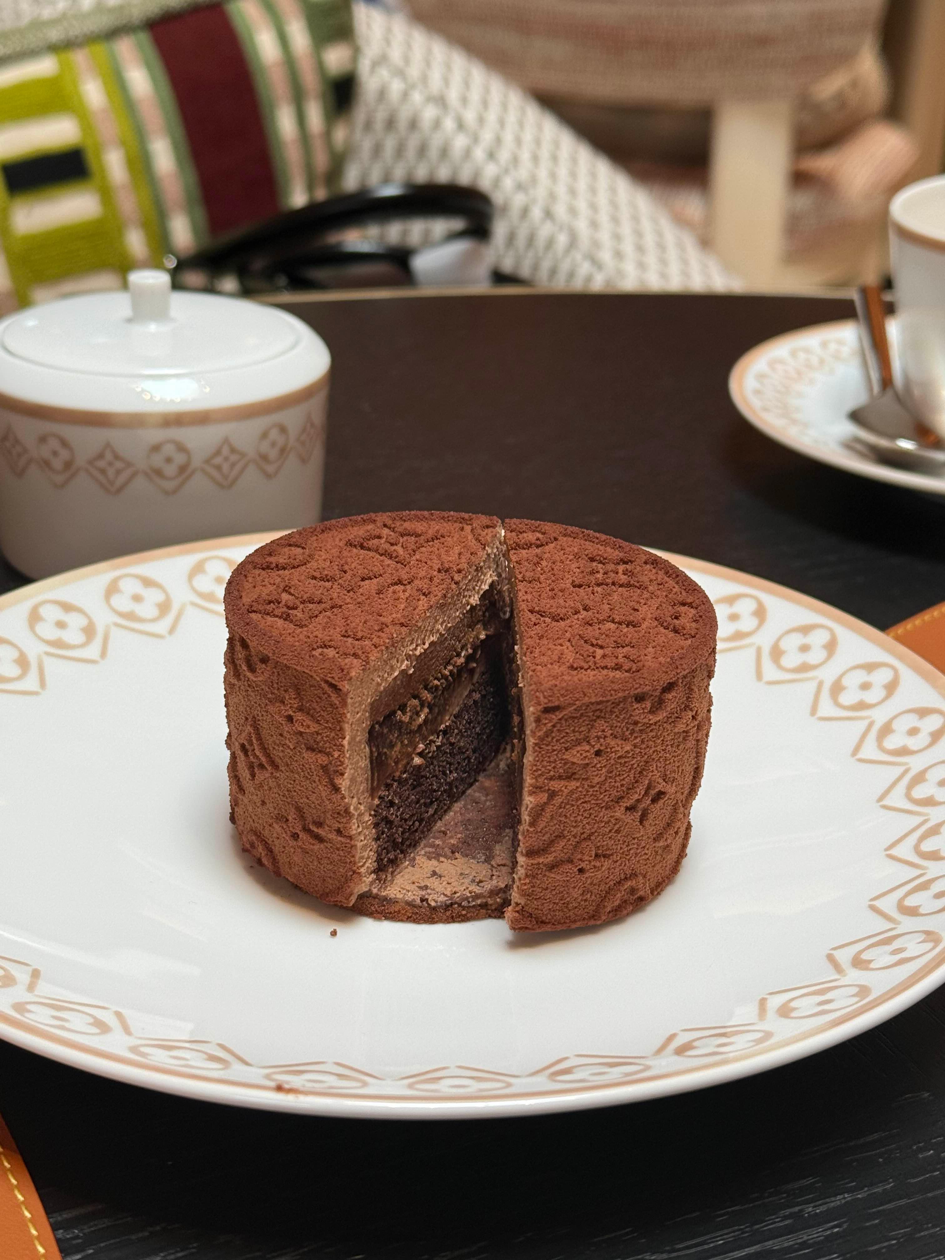 코코아 파우더에 LV 문양이 새겨진 케이크. 속은 진한 초콜릿 무스와 다크 케이크가 어우러져 꾸덕하면서도 부드러운 맛이 최고였어.