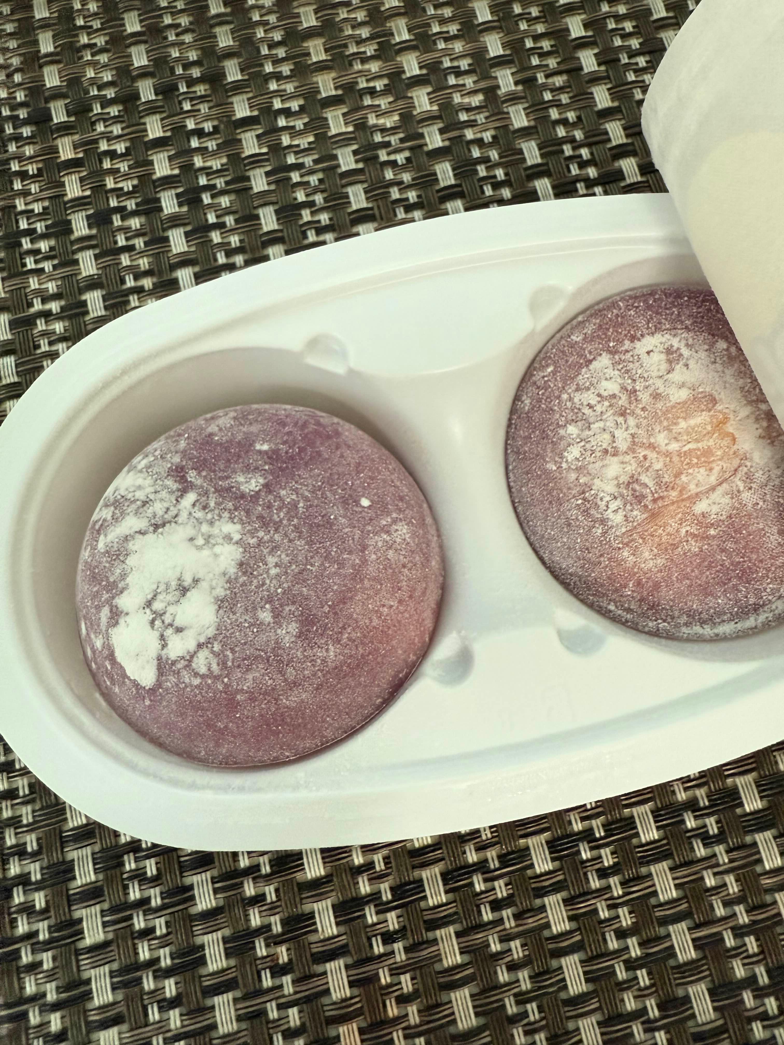 뚜껑을 열면 보라빛 찰떡피 두 개가 가지런히 들어 있고, 위에 옅은 전분가루가 뿌려져 있어서 찰떡 특유의 비주얼을 살려주더라.