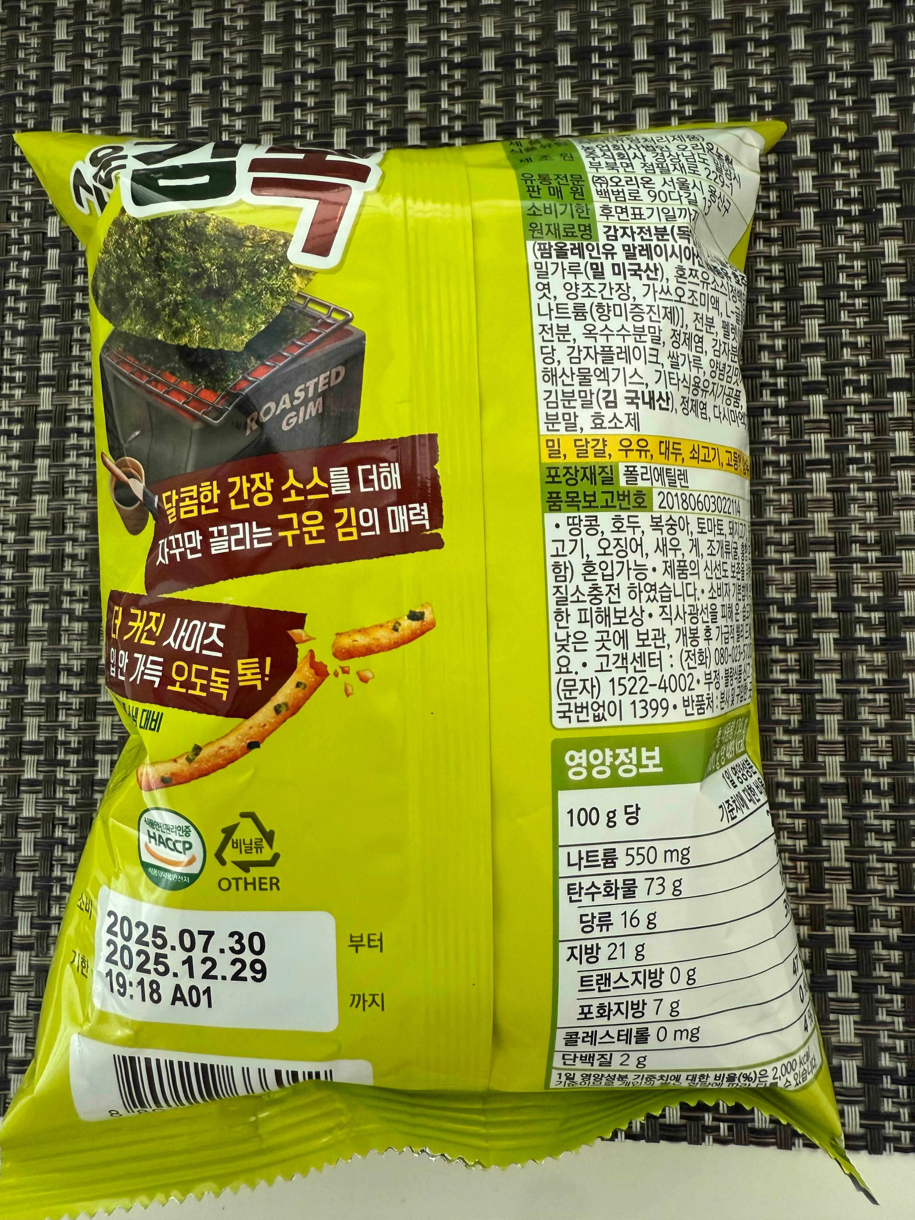 ✔️ 맛: 김 특유의 바다향과 고소함이 먼저 느껴지고, 뒤이어 간장 양념의 달콤짭조름함이 따라와. 특히 간이 세지 않고 은근하게 감도는 간장 풍미가 과자와 잘 어울려서 부담 없이 계속 손이 가더라.