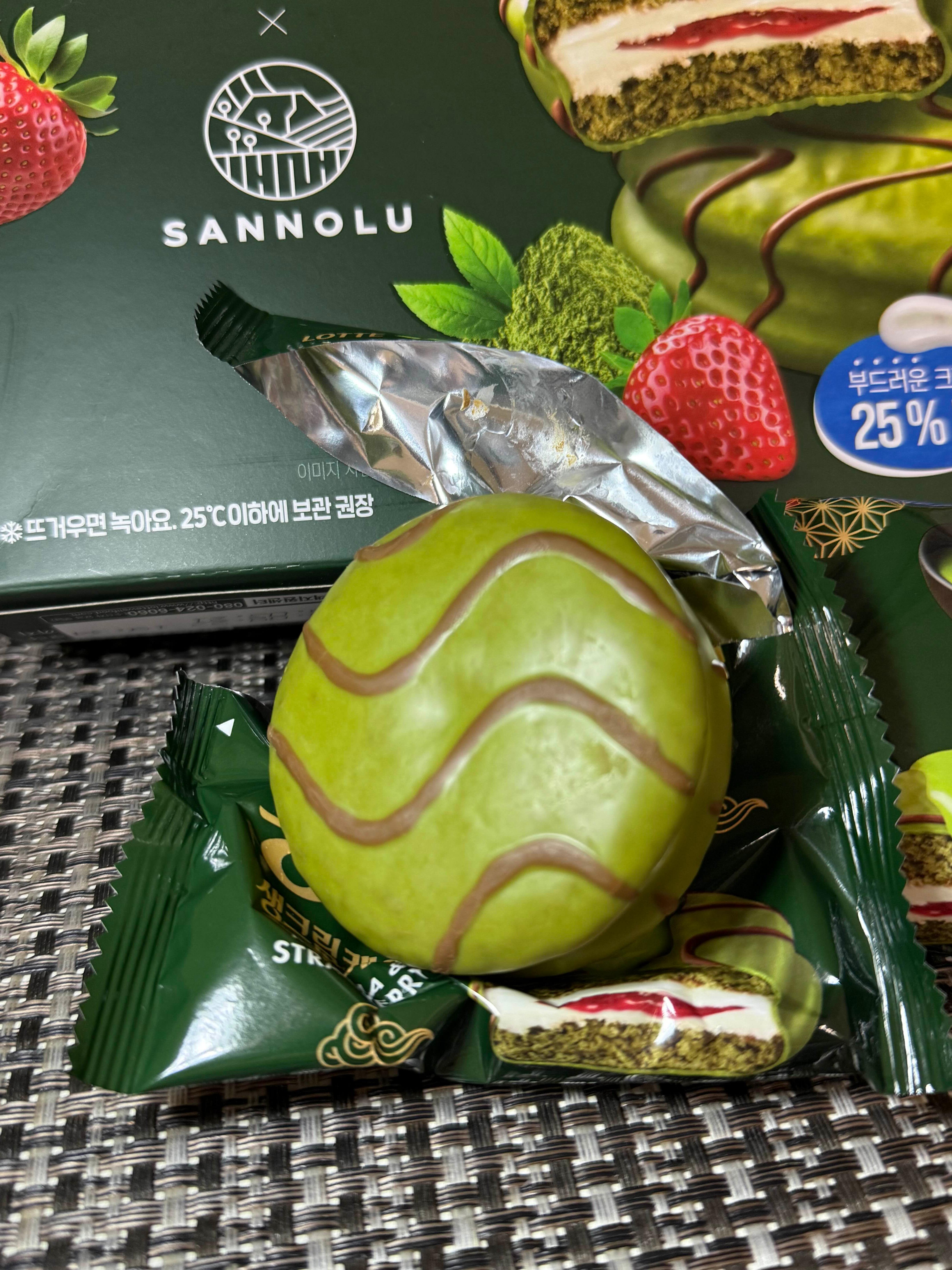 진한 녹차 초코 코팅에 상큼한 딸기크림이 들어가서 보기만 해도 고급스러운 느낌.
