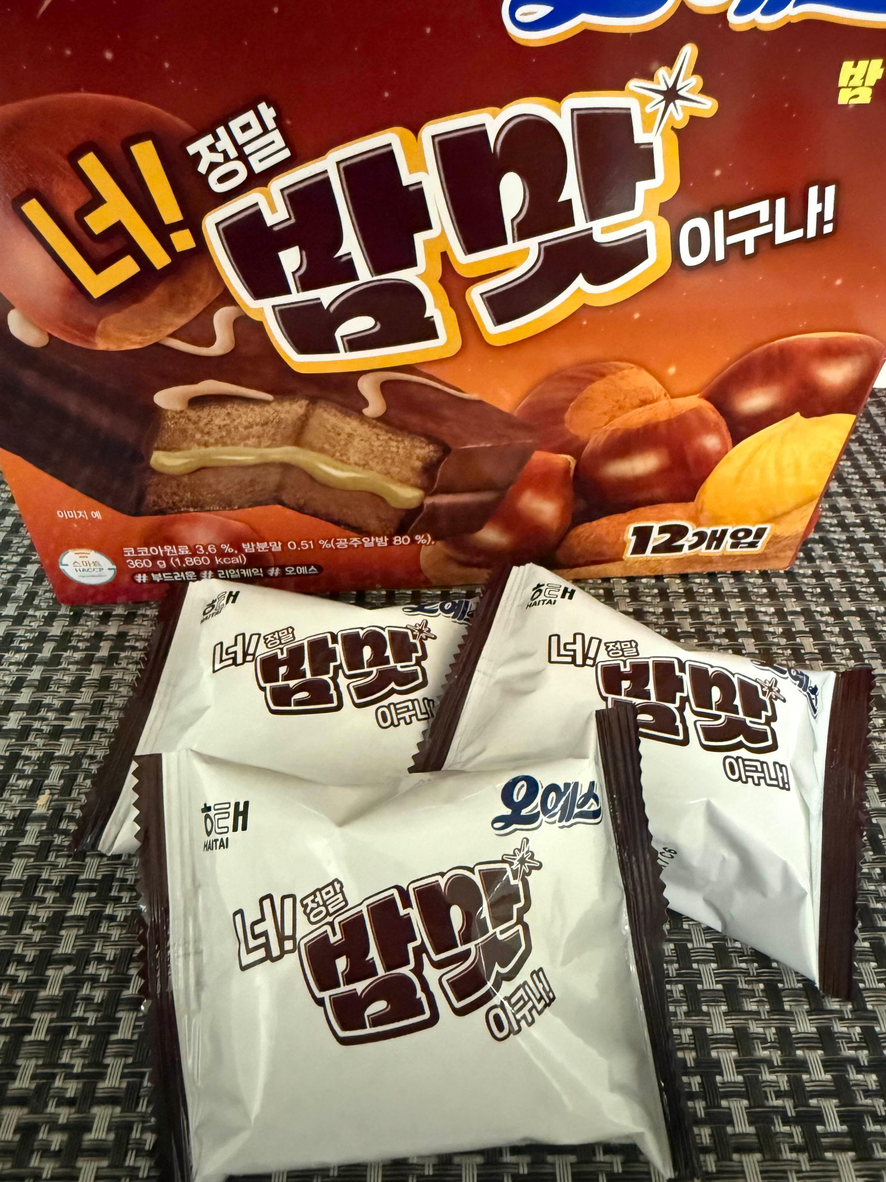박스 패키지에는 큼지막한 밤 그림이 가득 들어가 있고, 갈색 톤 배경이 따뜻하면서도 진중한 분위기를 주더라. 12개입이라 한 번 뜯으면 가족이나 친구랑 나눠 먹기도 딱 좋아.