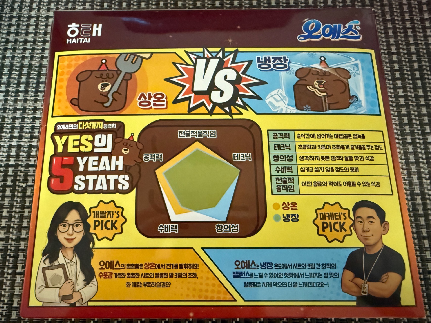 • 기존 오리지널 오예스가 진득한 초콜릿 맛이라면, 이건 그 달콤함 사이에 밤의 은은한 향이 더해져서 조금 더 부드럽고 계절감 있는 맛이야.