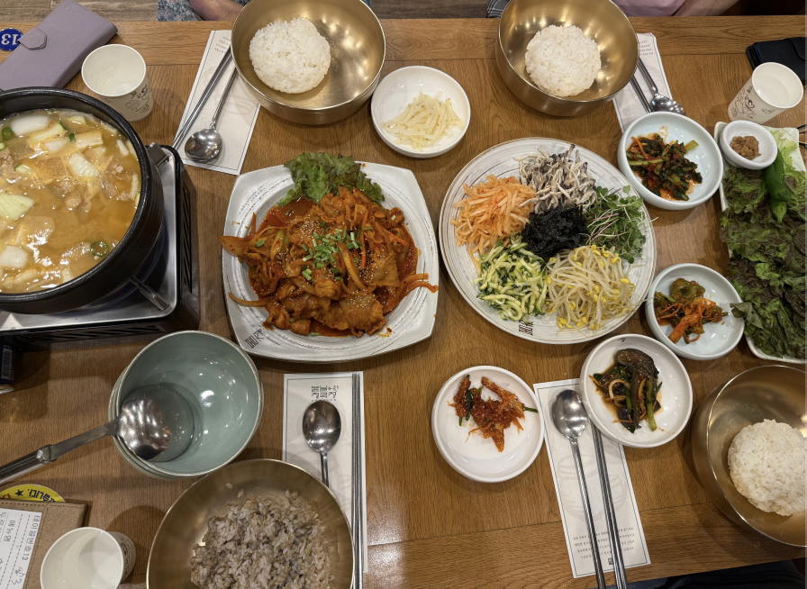 정갈한 반찬과 구수한 청국장, 그리고 함께 곁들여진 제육볶음과 비빔밥까지.