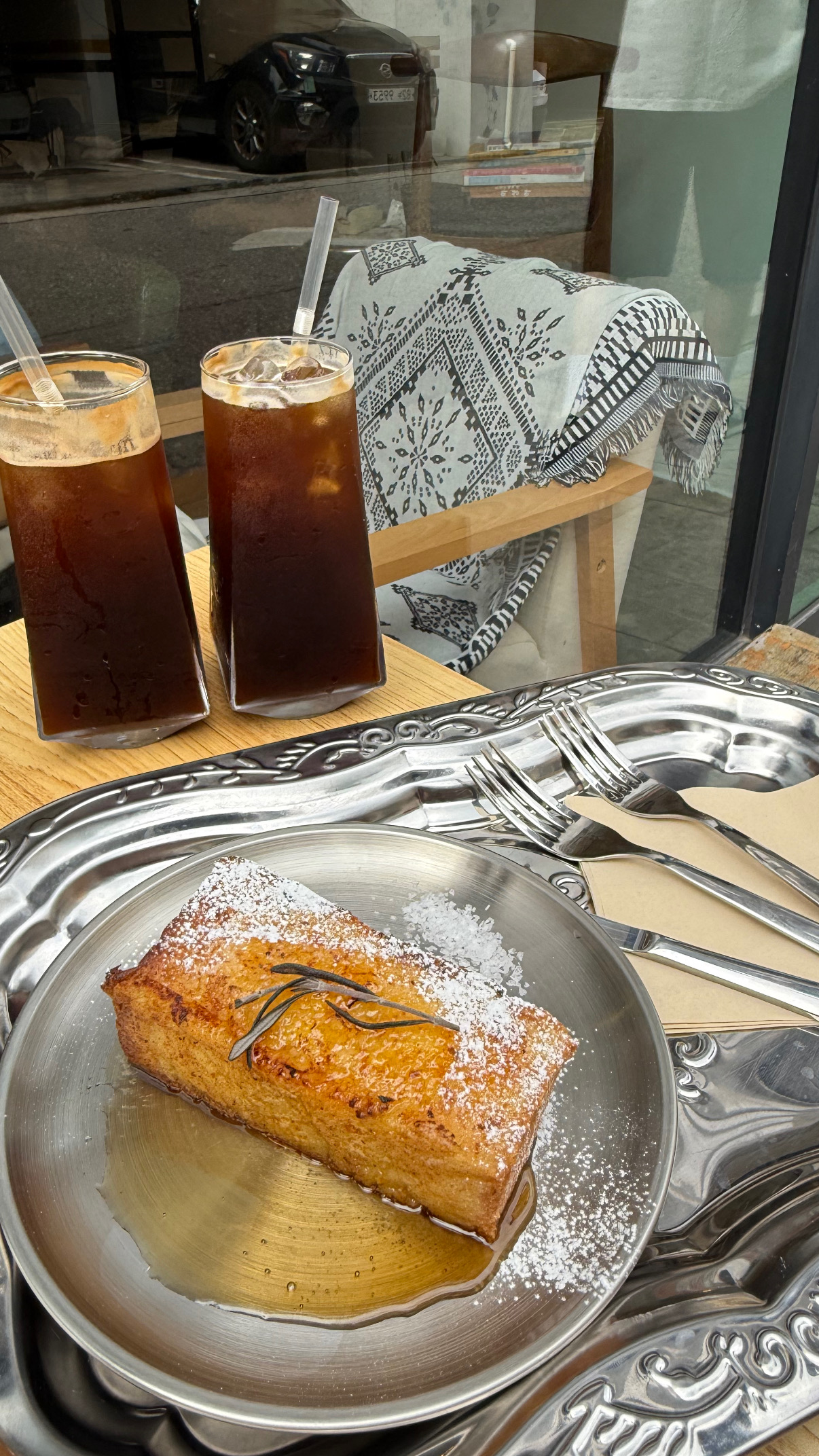 이 집의 시그니처 메뉴. 두툼한 빵을 노릇하게 구워내고 위에 슈거파우더와 허브를 올려 비주얼부터 만족스러웠다. 시럽이 살짝 흘러내리며 접시에 고이는 모습이 입맛을 자극한다. 겉은 바삭하고 속은 촉촉하게 살아있어 커피랑 곁들여 먹으니 딱 맞는 조합. 일반적인 프렌치토스트보다 묵직하고 식감이 좋아서 든든하게 한 끼 해결하는 느낌이었다.