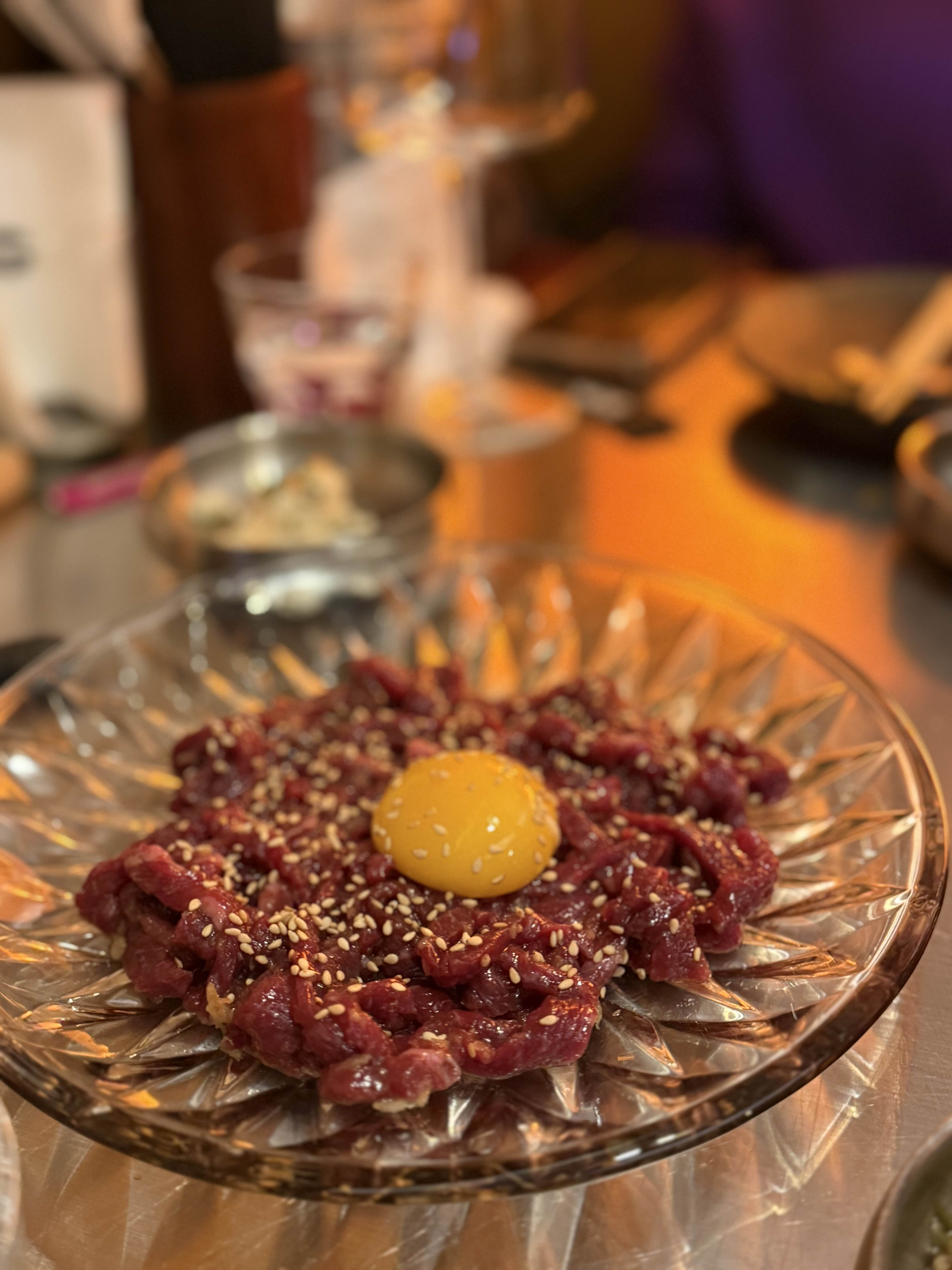 : 참기름과 깨소금, 노른자가 올라가 고소함 가득. 고기 질이 워낙 좋아 생으로 먹어도 부담 없음.