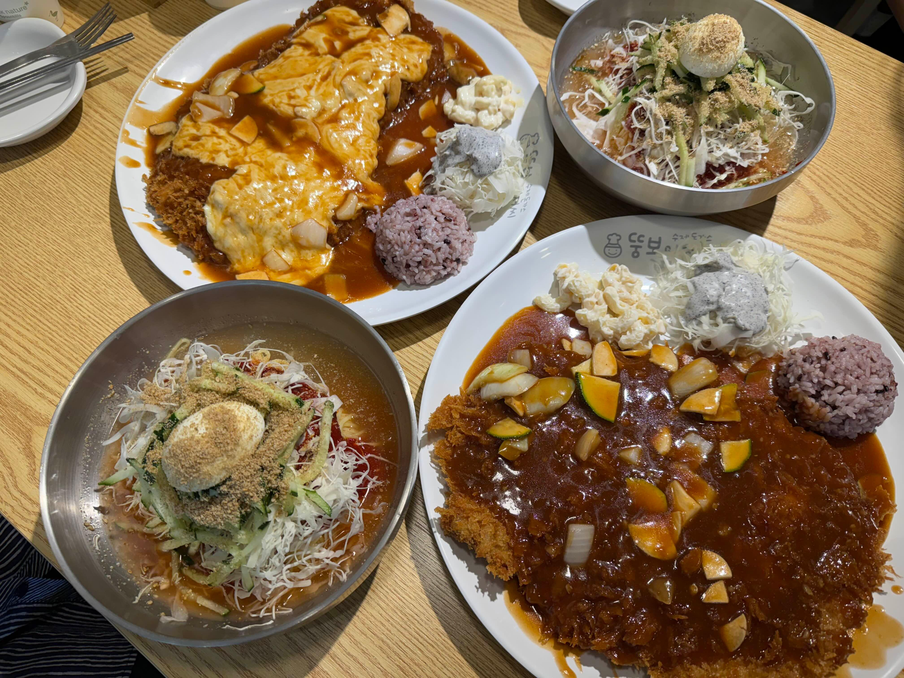 : 무더운 날 함께 곁들이기 좋은 시원한 선택! 면이 탱글하고 간도 적당해 새콤하여 돈까스와 먹기 딱 좋아요. 고명도 아낌없이 올라가 있어요.