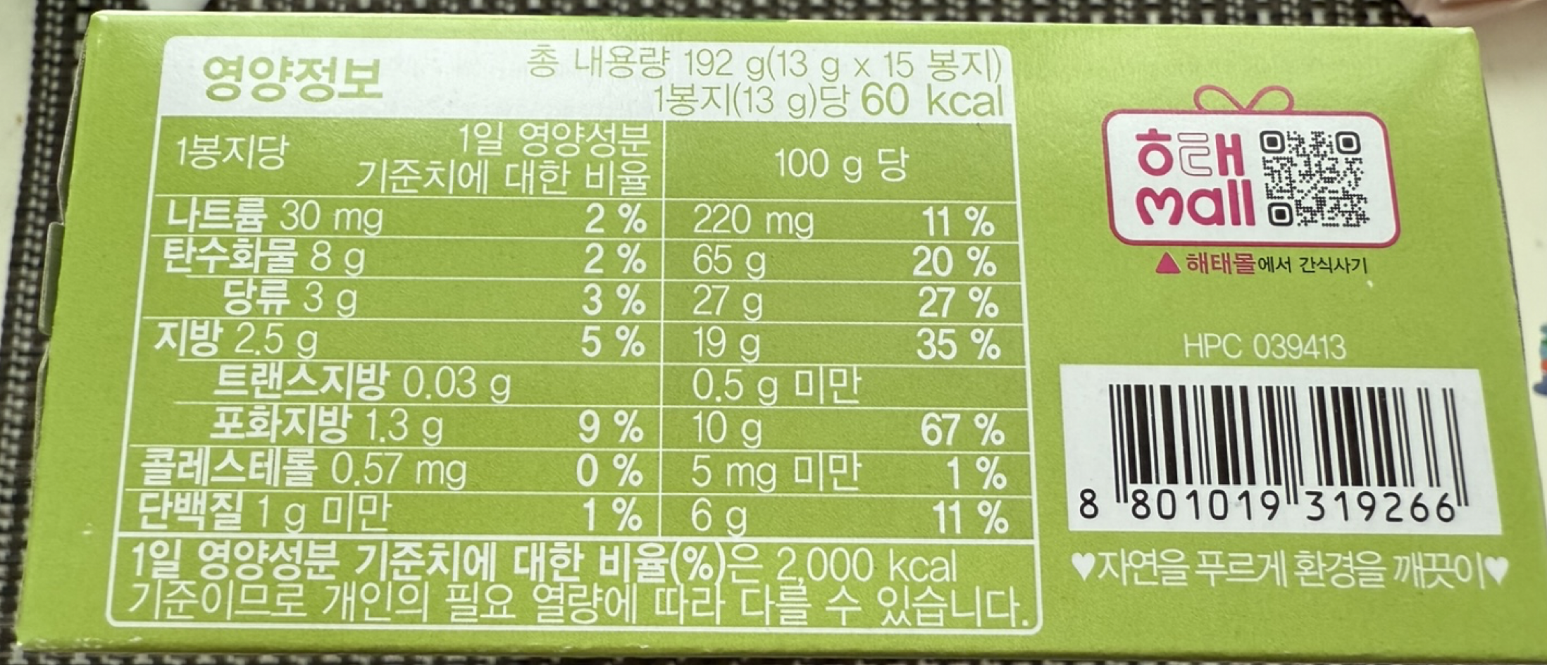 총내용량은 192g( 13g * 15 봉지)