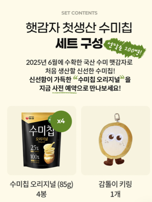 농심몰에서 25년 6월 수확한 국산 수미 햇감자로 처음 생산한 신선한 수미칩을