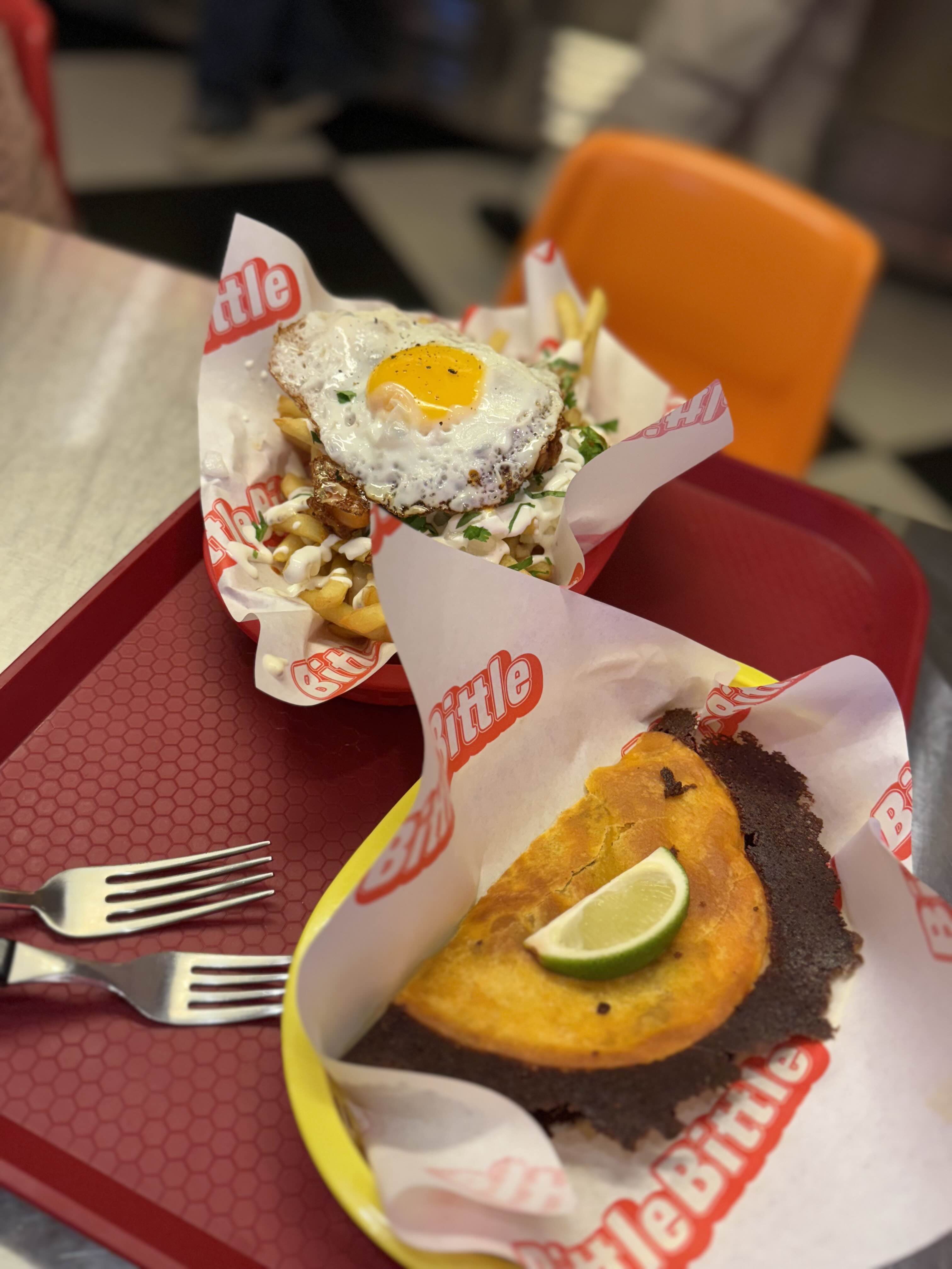 두툼한 감자튀김 위에 고기, 파슬리, 계란프라이까지!