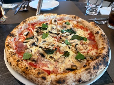 : 얇고 쫀득한 나폴리 스타일 화덕피자. 양송이,프로슈토의 조화를 이루고 기름기도 적당해서 담백했어요.