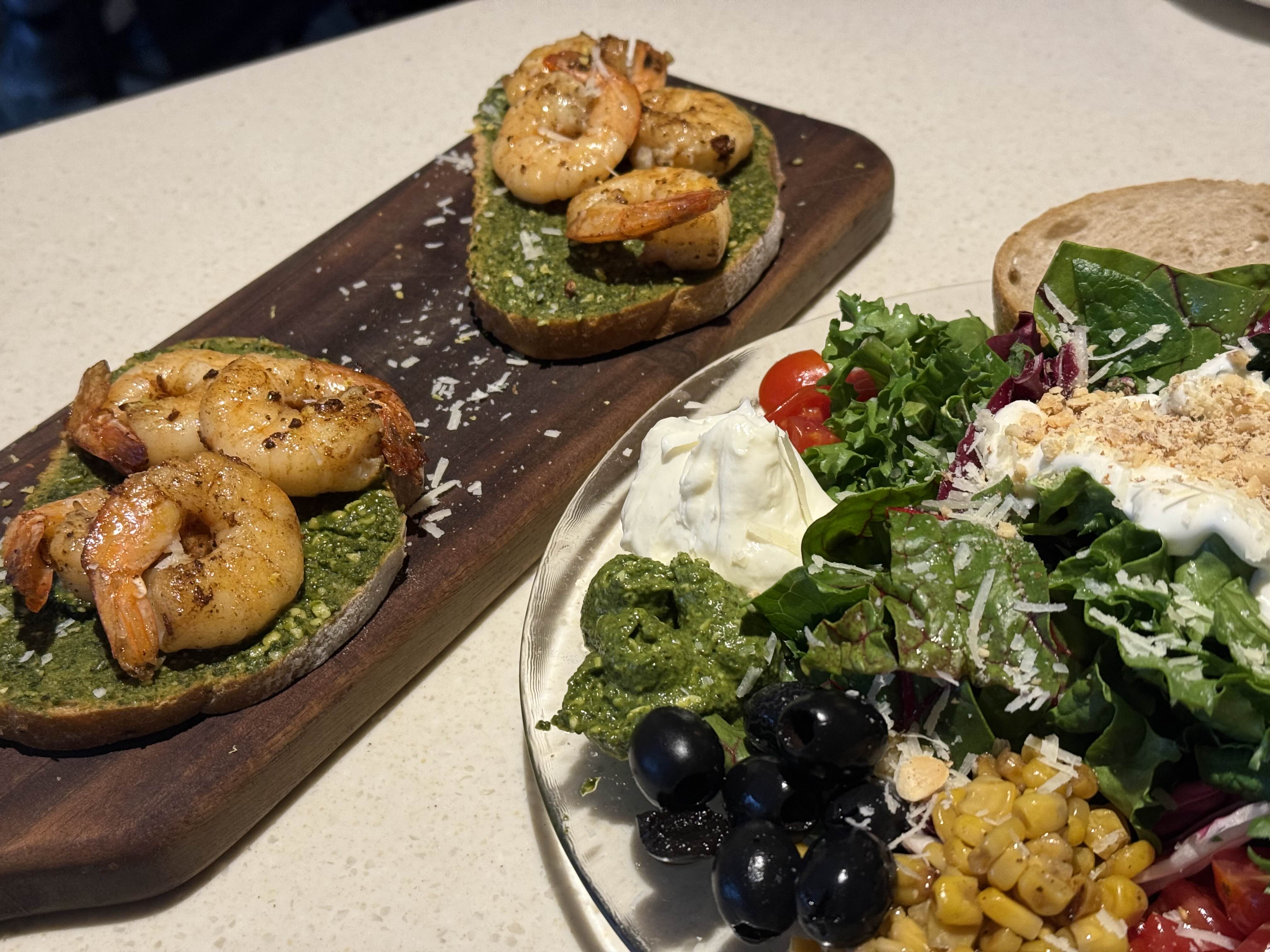 페스토를 바른 바게트 위에 통통한 새우가 얹혀져 고소하고 담백해요.