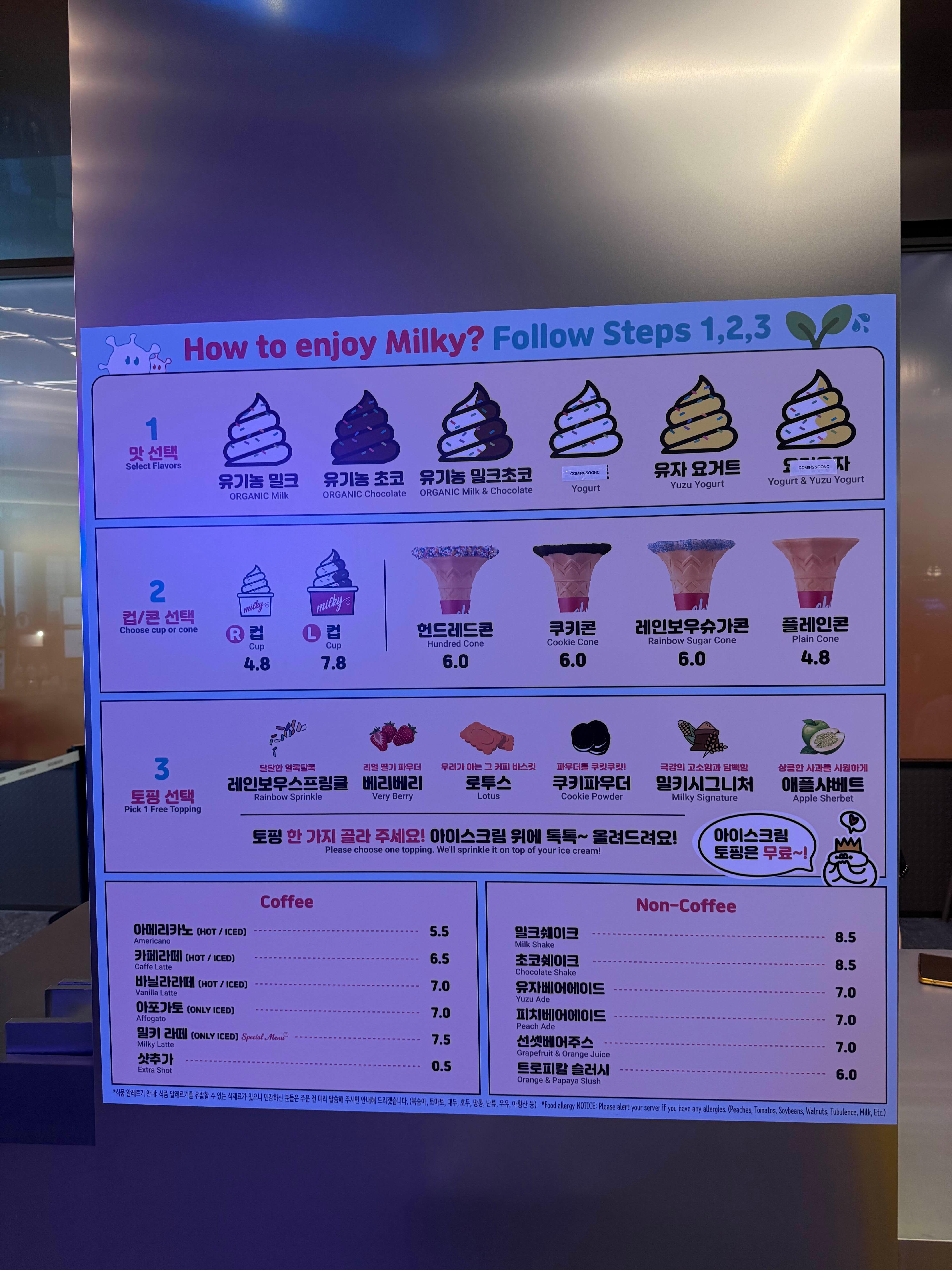 쏠비치 남해가 드디어 오픈했다고 해서 구경하러 갔는데, 지하 1층에서 우연히 이 매장을 발견했어. 네온사인으로 빛나는 “milky” 간판이 시선을 확 잡아끌더라. 매장은 모던하면서도 깔끔하게 꾸며져 있었고, 바다여행 중 가볍게 들러 달콤한 디저트를 즐기기에 딱 좋은 공간이야.