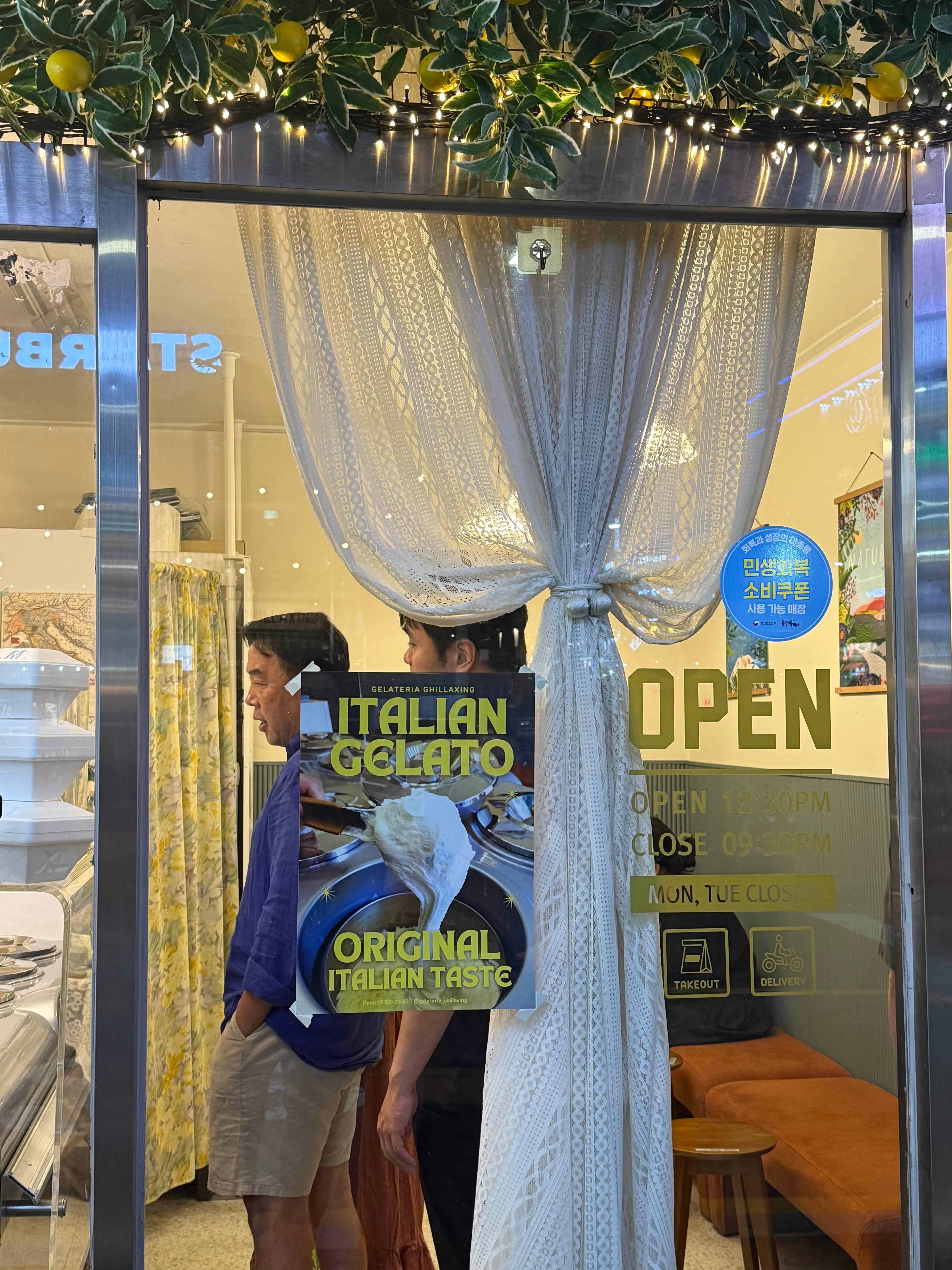 외관부터 유럽 감성이 물씬 풍겨. 레몬 나무 장식이 달린 입구, 반짝이는 전구 조명, 그리고 레이스 커튼이 매장을 따뜻하고 아기자기하게 만들어줘. 내부는 크진 않지만 깔끔하게 정돈돼 있고, 오픈형 주방이라 젤라또 만드는 과정을 바로 볼 수 있어서 믿음직했어.