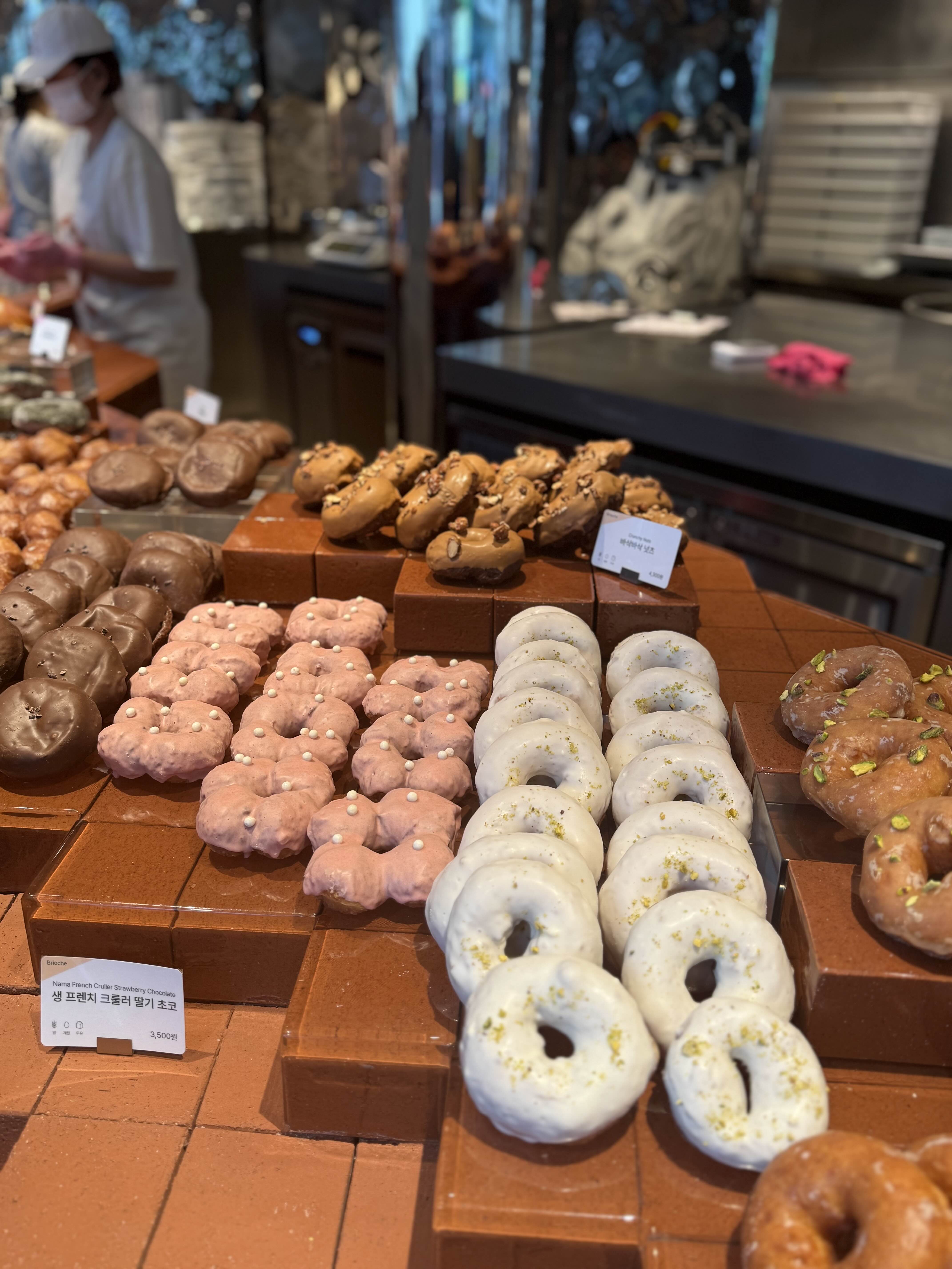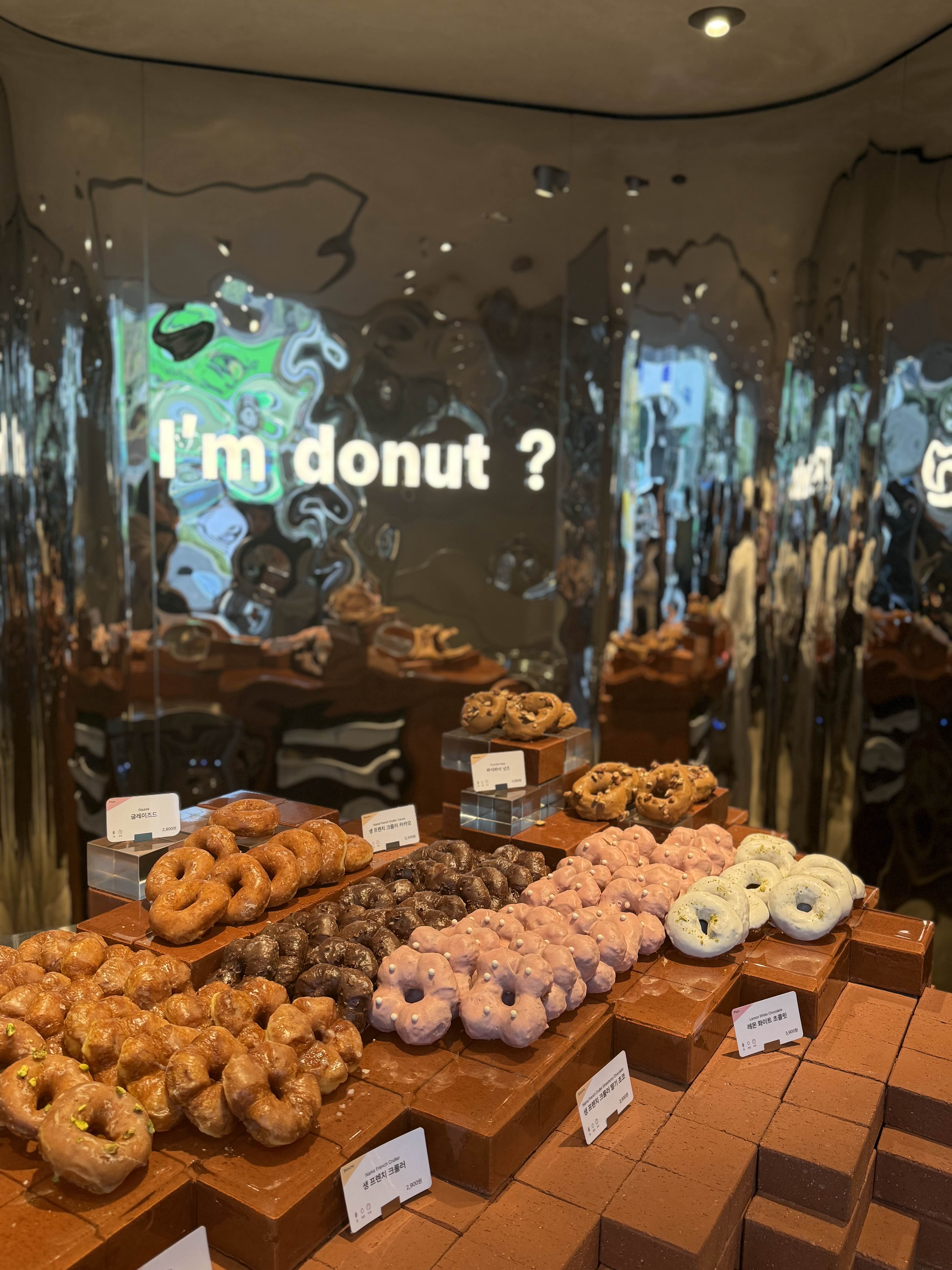 성수역 4번 출구에서 도보 5분 거리, 이미 멀리서부터 보이는 긴 줄이 아임도넛의 인기를 증명한다. 내부는 미러 인테리어와 벽돌 위 도넛 진열이 독특하고, 굿즈샵까지 있어서 단순한 도넛집이 아니라 브랜드 체험 공간 같았다.