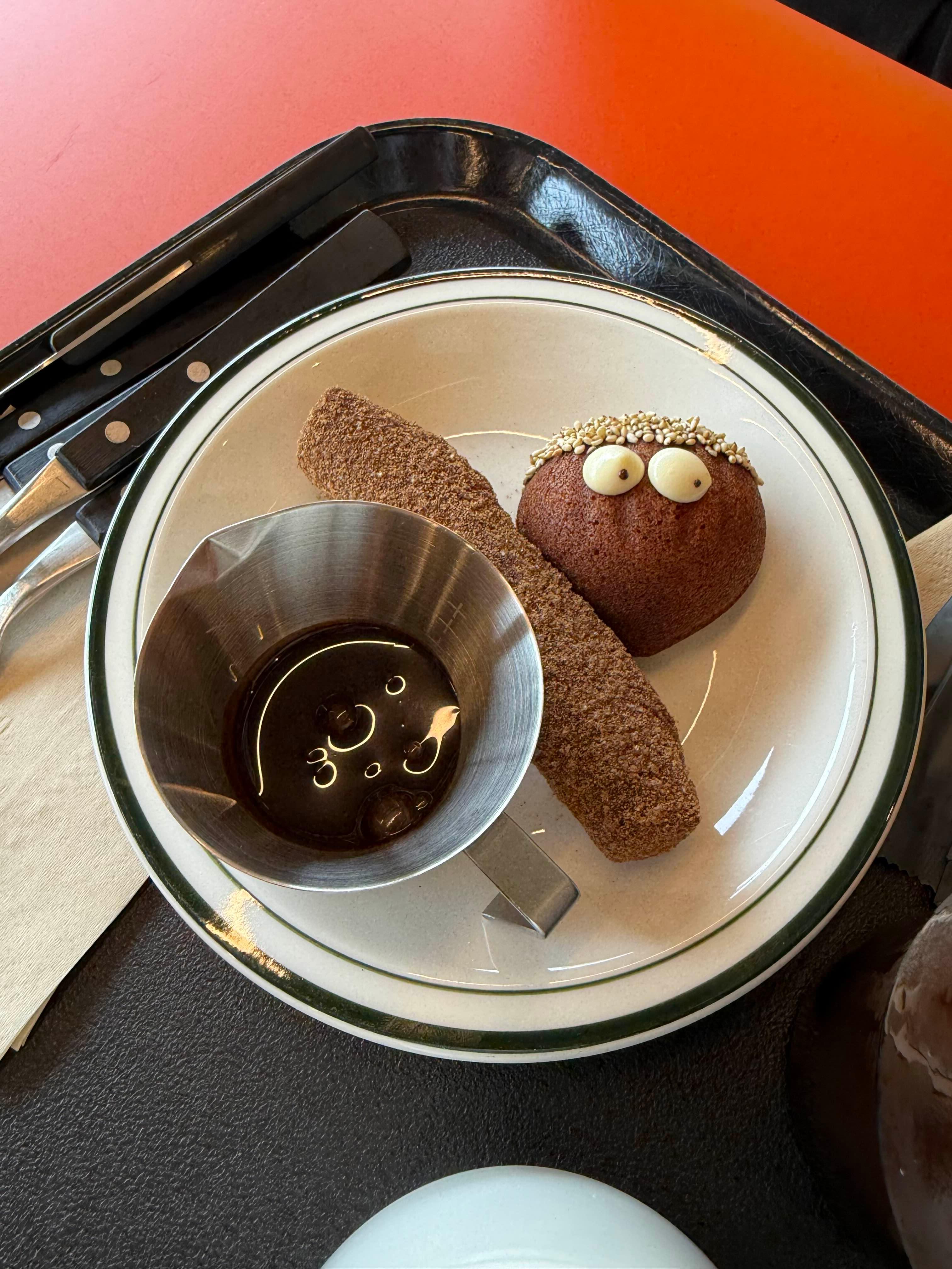 : 귀여운 눈알 모양의 동그란 디저트. 진한 초콜릿 풍미와 폭신한 식감이 매력적이에요. 견과류가 포인트처럼 올라가 있어 고소함도 한 스푼! 보기만 해도 기분 좋아지는 비주얼.