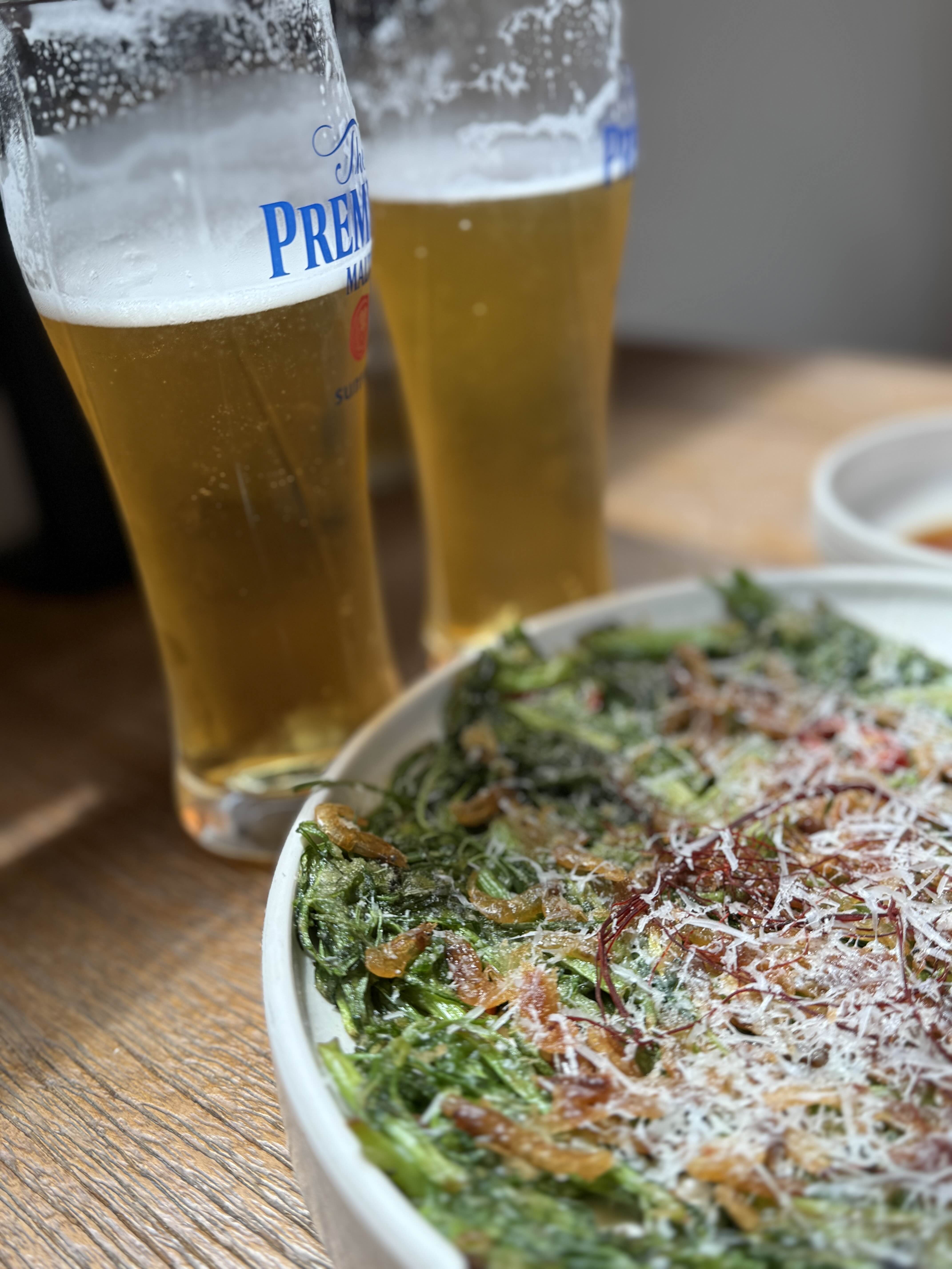 보리와 미나리, 새우가 듬뿍 들어간 전. 바삭하게 부쳐낸 전 위에 치즈가루가 솔솔 뿌려져 고소함이 배가됨. 맥주와 찰떡궁합.