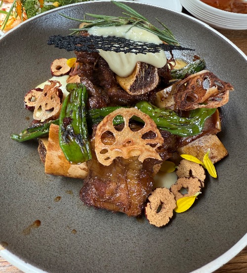 달콤짭짤하게 졸여진 갈비찜 위에 부드러운 밤퓨레가 올라가 부드러움과 깊은 맛을 동시에. 연근칩, 꽈리고추, 허브 토핑으로 비주얼까지 완벽. 갈비살은 야들야들하고, 밤퓨레와 곁들이면 고급진 풍미가 입안 가득.