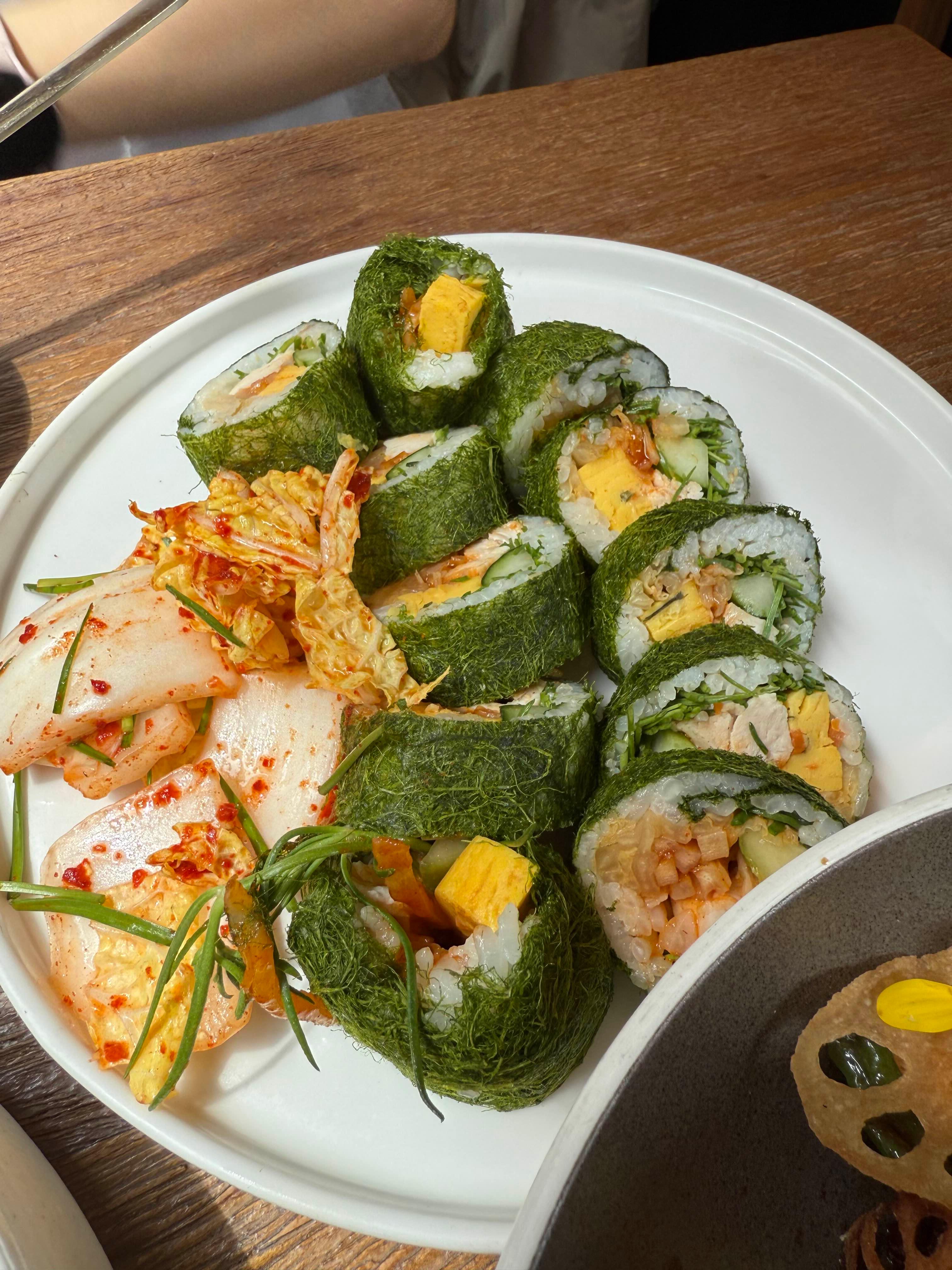 묵은지의 감칠맛과 감태의 바다향이 만나 색다른 김밥. 안에는 계란말이, 닭가슴살, 오이, 볶음김치 등 담백하고 깔끔한 재료들이 조화를 이룸. 곁들임 백김치도 상큼하니 잘 어울림.