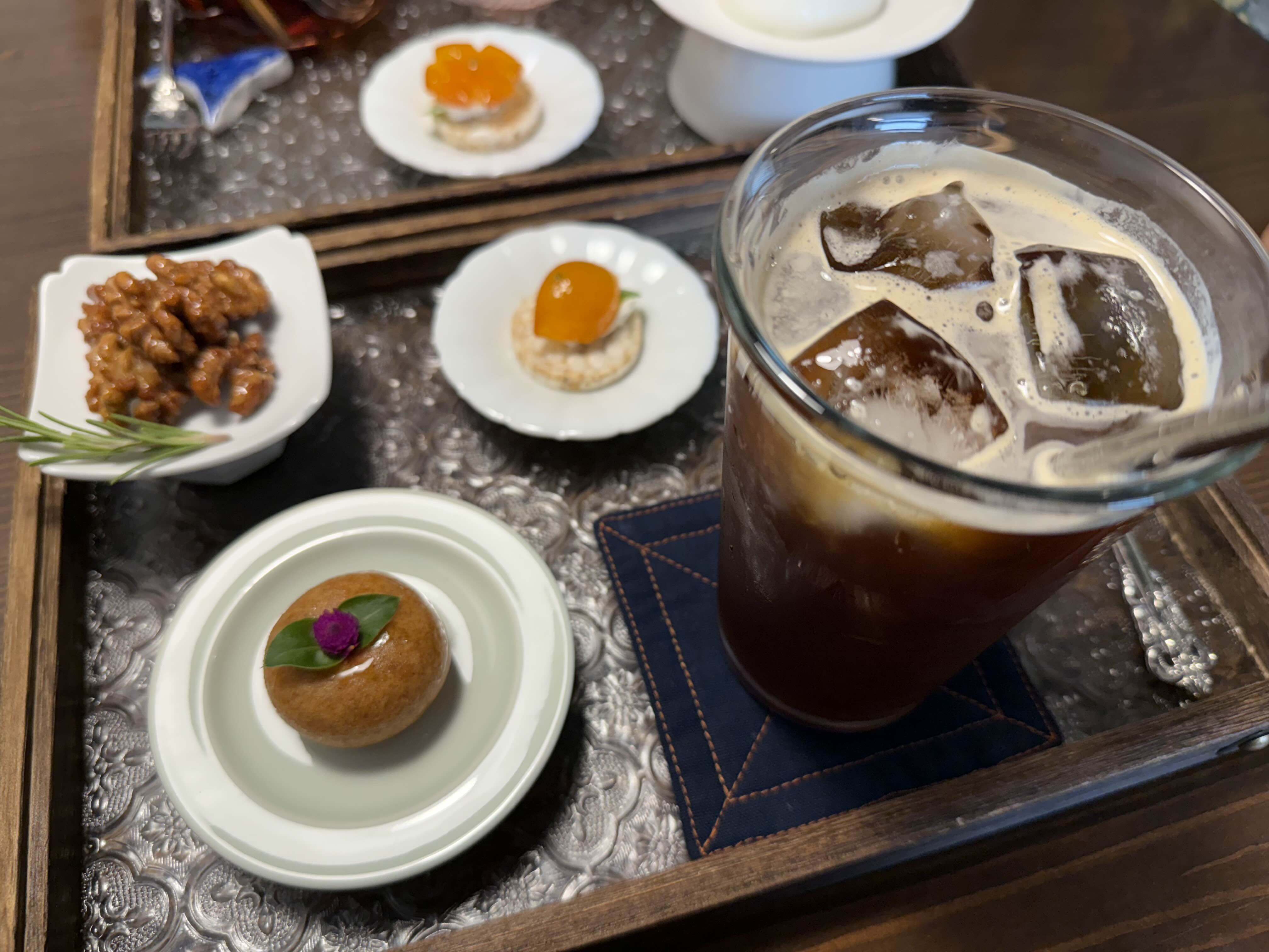 아이스 아메리카노와 다과 세트. 고소한 견과류와 화과자, 앙증맞은 다식들이 함께 나와 커피의 쌉싸름함과 조화를 이룬다. 커피는 깔끔한 산미와 고소함이 동시에 느껴졌고, 다과와 함께 먹으니 한 상 차림 그대로 차분한 티타임이 완성된다.
