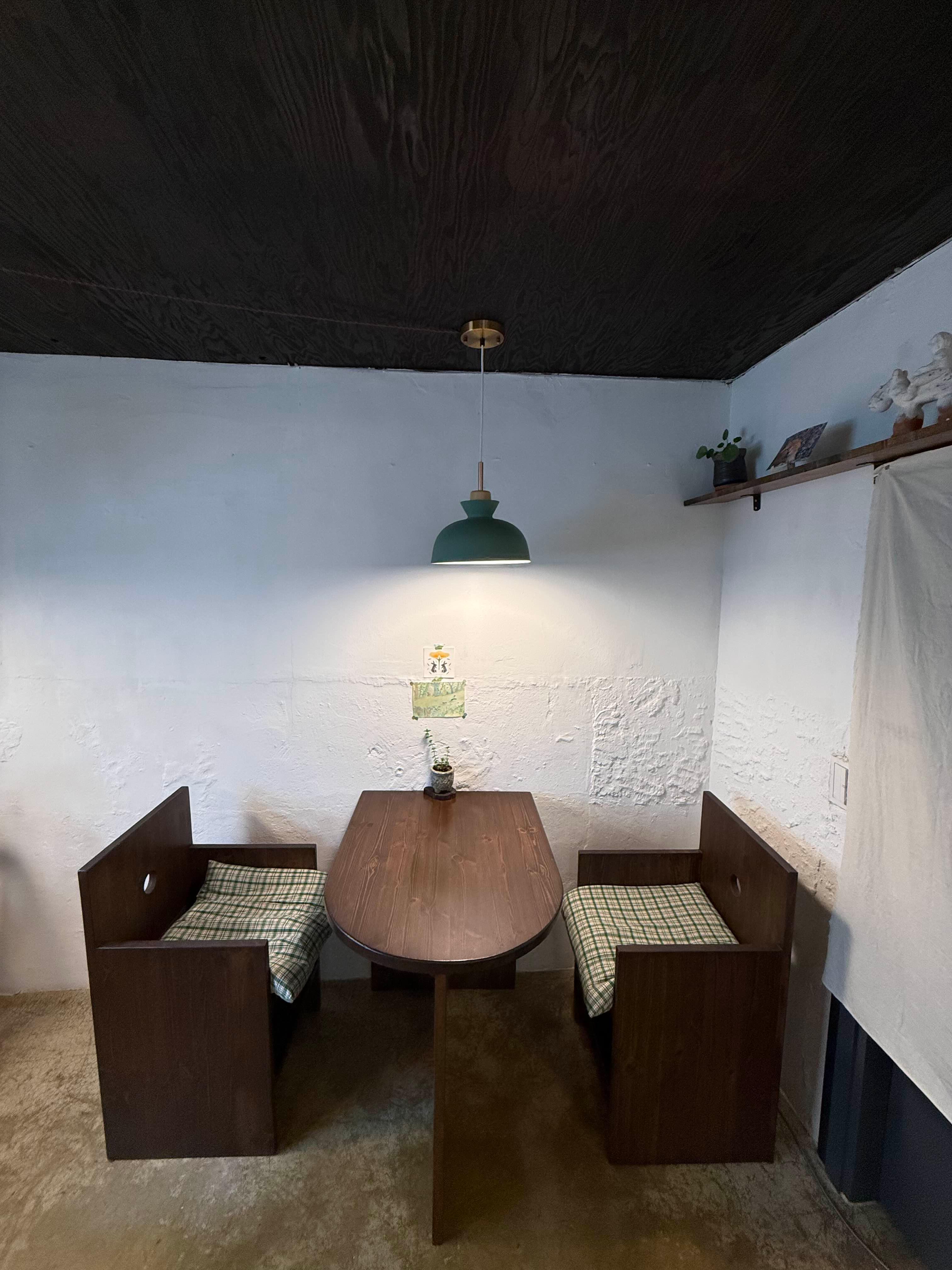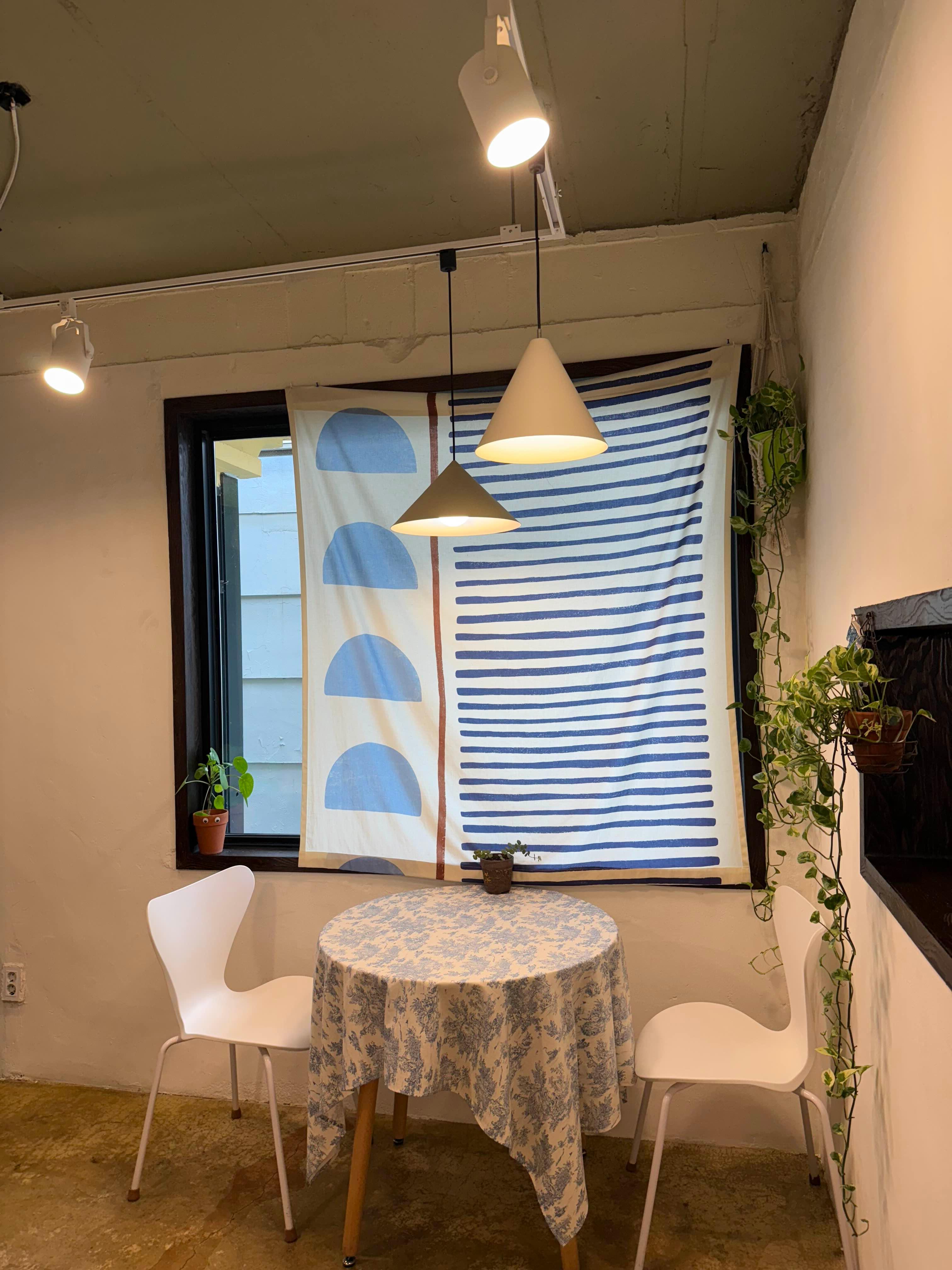 안으로 들어가면 오래된 가옥을 개조한 듯 소박하면서도 아늑한 감성이 느껴진다. 흰 벽과 나무 가구, 테이블마다 다른 무늬의 테이블보와 소품들이 놓여 있어서 하나의 작은 방처럼 아늑하다. 작은 창문으로 들어오는 빛, 그리고 곳곳에 걸린 식물들이 공간을 포근하게 채워준다. 좌석 수도 많지 않아 조용히 담소 나누거나 혼자 책 읽기에도 잘 어울리는 곳이다.