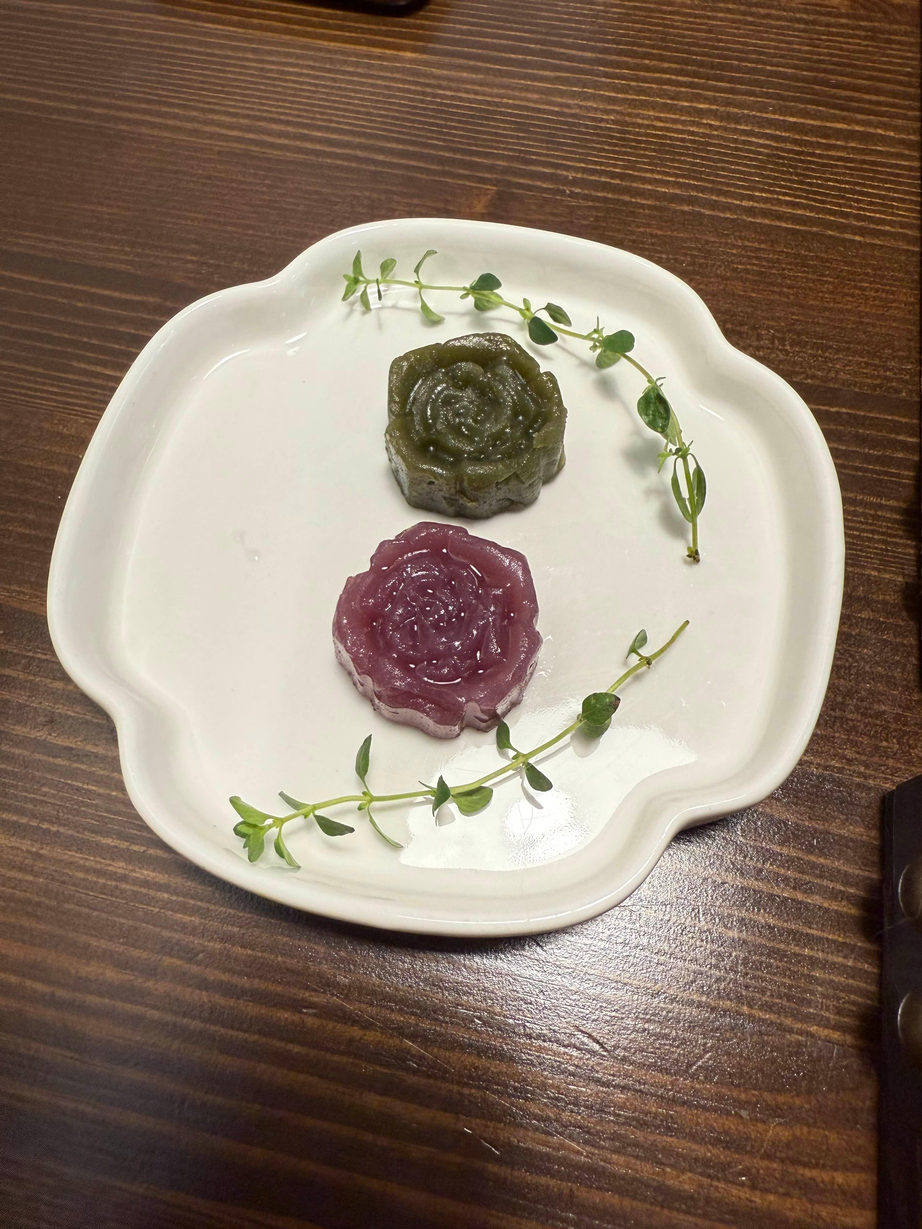 유리 티팟에 담긴 꽃차와 다과들이 트레이 위에 예쁘게 세팅된다. 찹쌀떡 위에 작은 꽃잎 장식이 올라간 모습은 먹기 전부터 눈을 즐겁게 해준다. 은은한 꽃차 향이 기분을 차분하게 만들어주고, 달지 않은 전통 다과와 잘 어울린다.