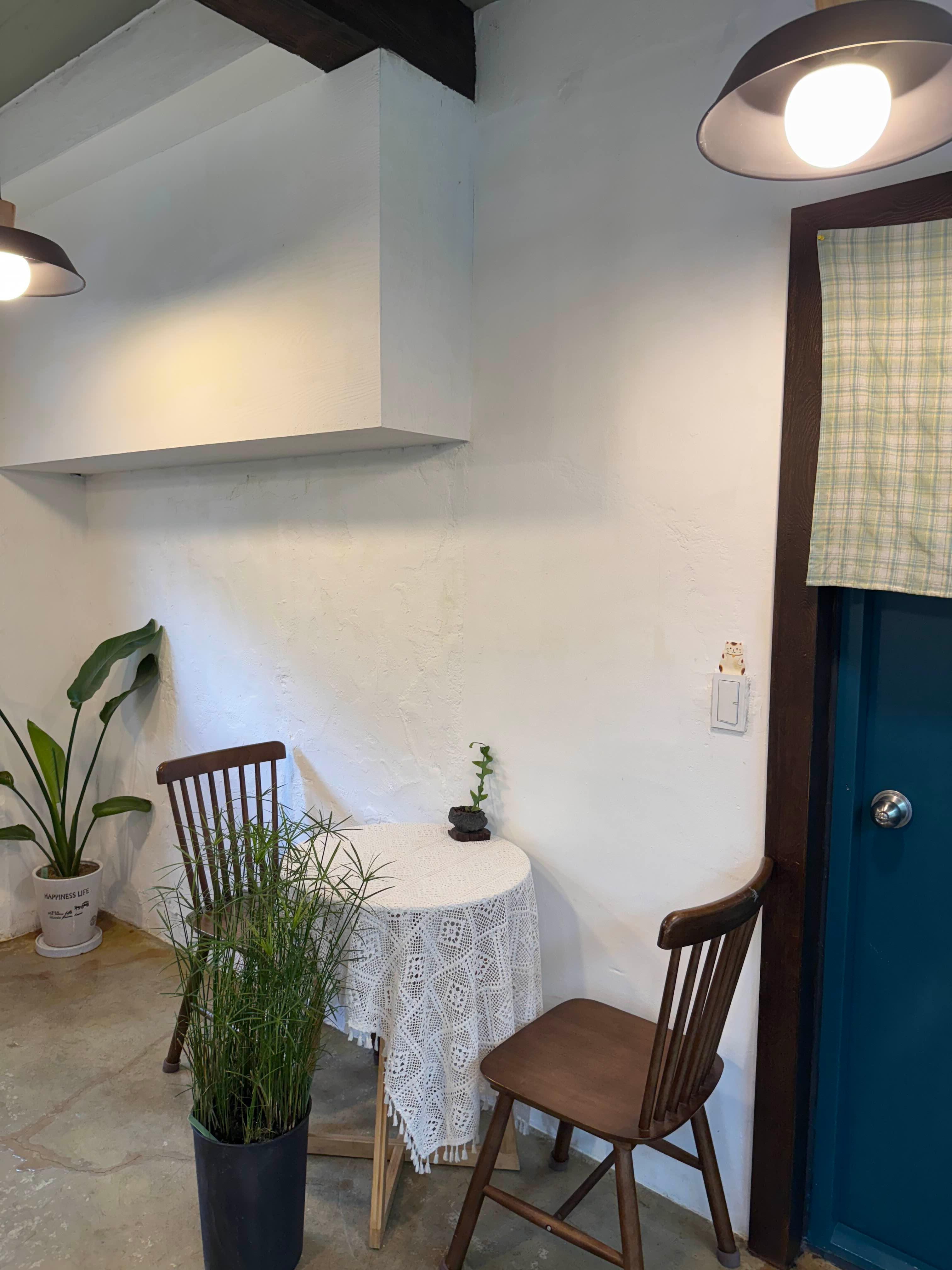 안으로 들어가면 오래된 가옥을 개조한 듯 소박하면서도 아늑한 감성이 느껴진다. 흰 벽과 나무 가구, 테이블마다 다른 무늬의 테이블보와 소품들이 놓여 있어서 하나의 작은 방처럼 아늑하다. 작은 창문으로 들어오는 빛, 그리고 곳곳에 걸린 식물들이 공간을 포근하게 채워준다. 좌석 수도 많지 않아 조용히 담소 나누거나 혼자 책 읽기에도 잘 어울리는 곳이다.