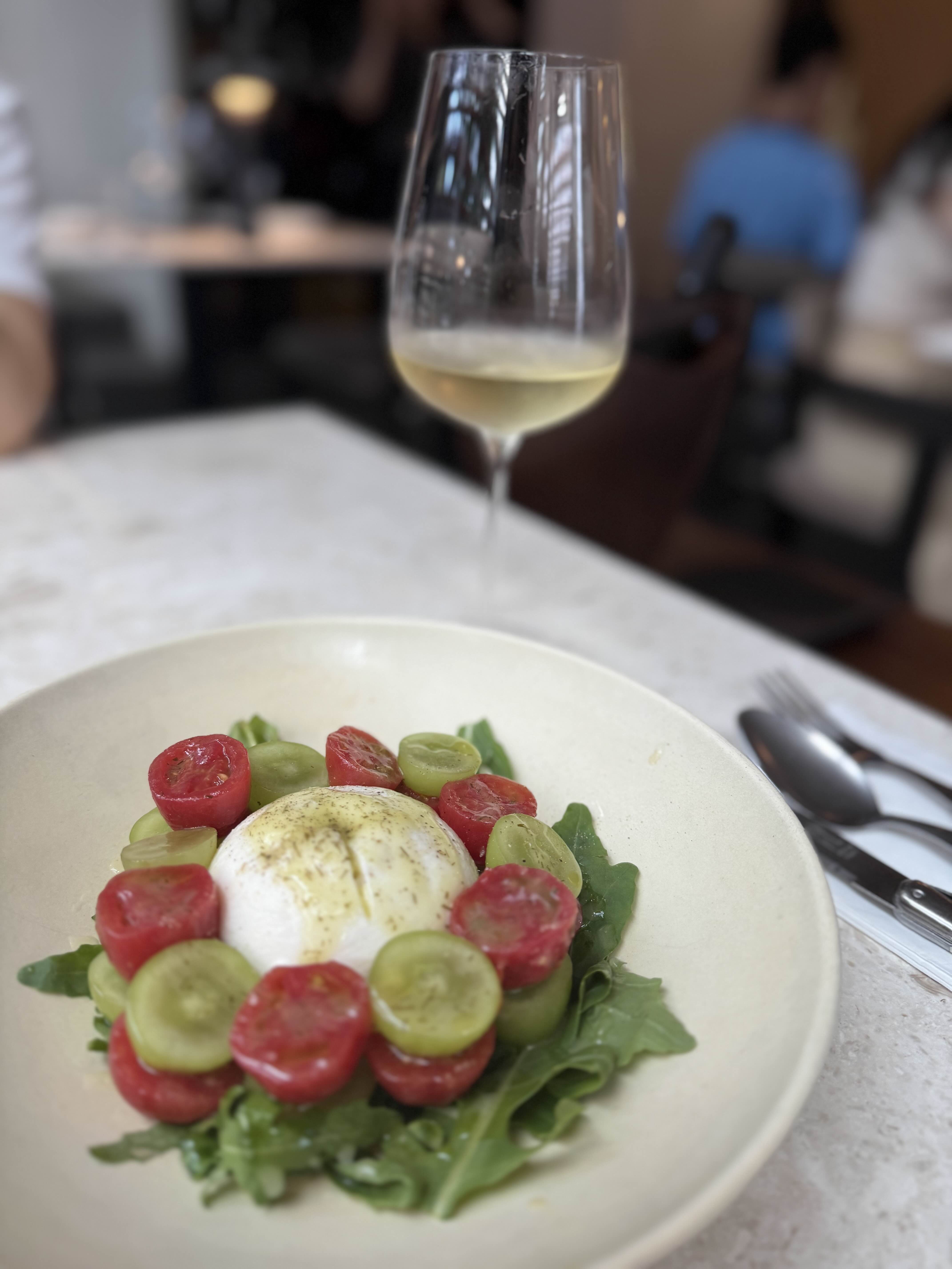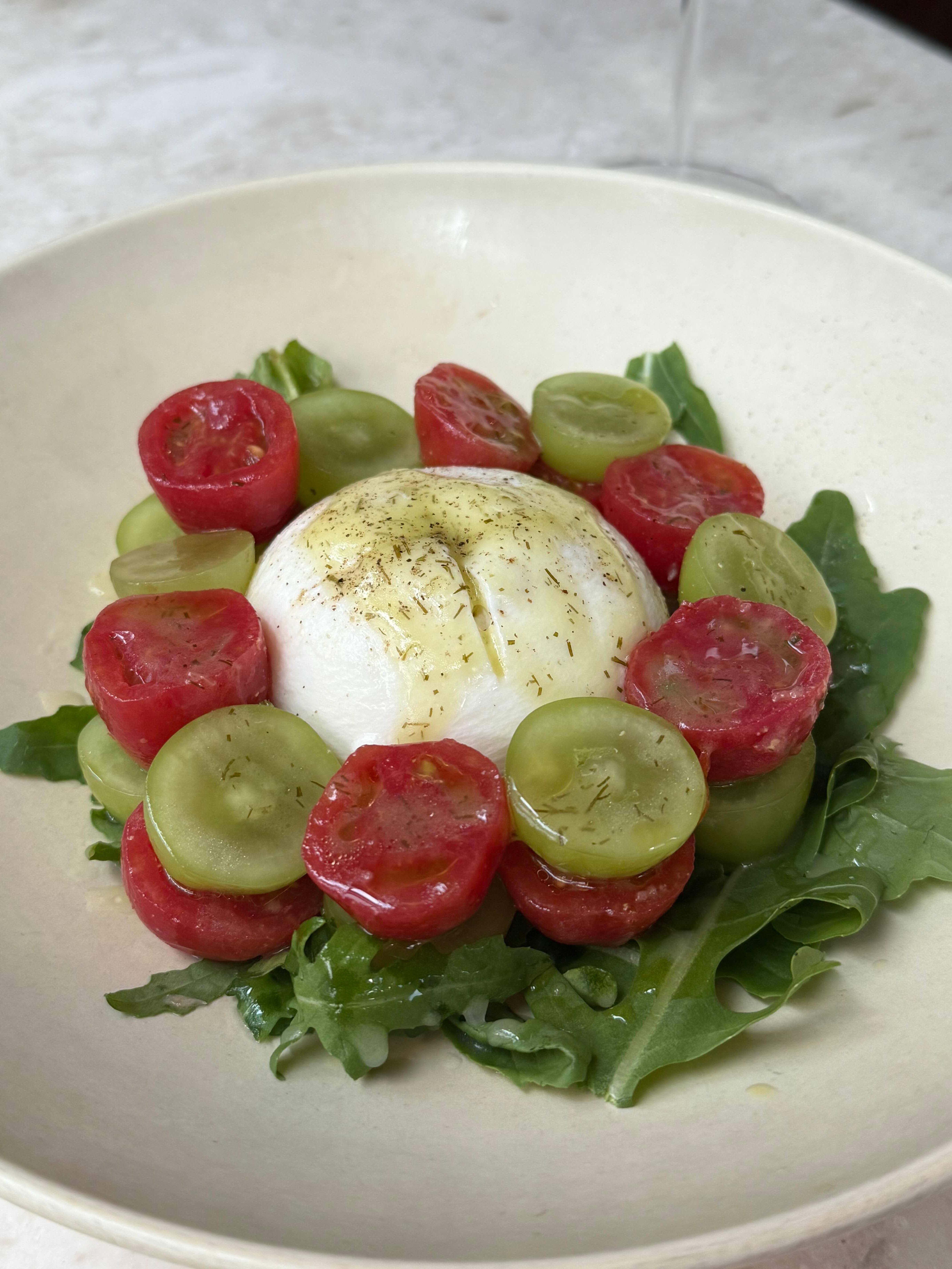 루꼴라 위에 부라타 치즈를 올리고 방울토마토와 청포도를 곁들인 샐러드. 고소한 치즈와 상큼한 토마토,