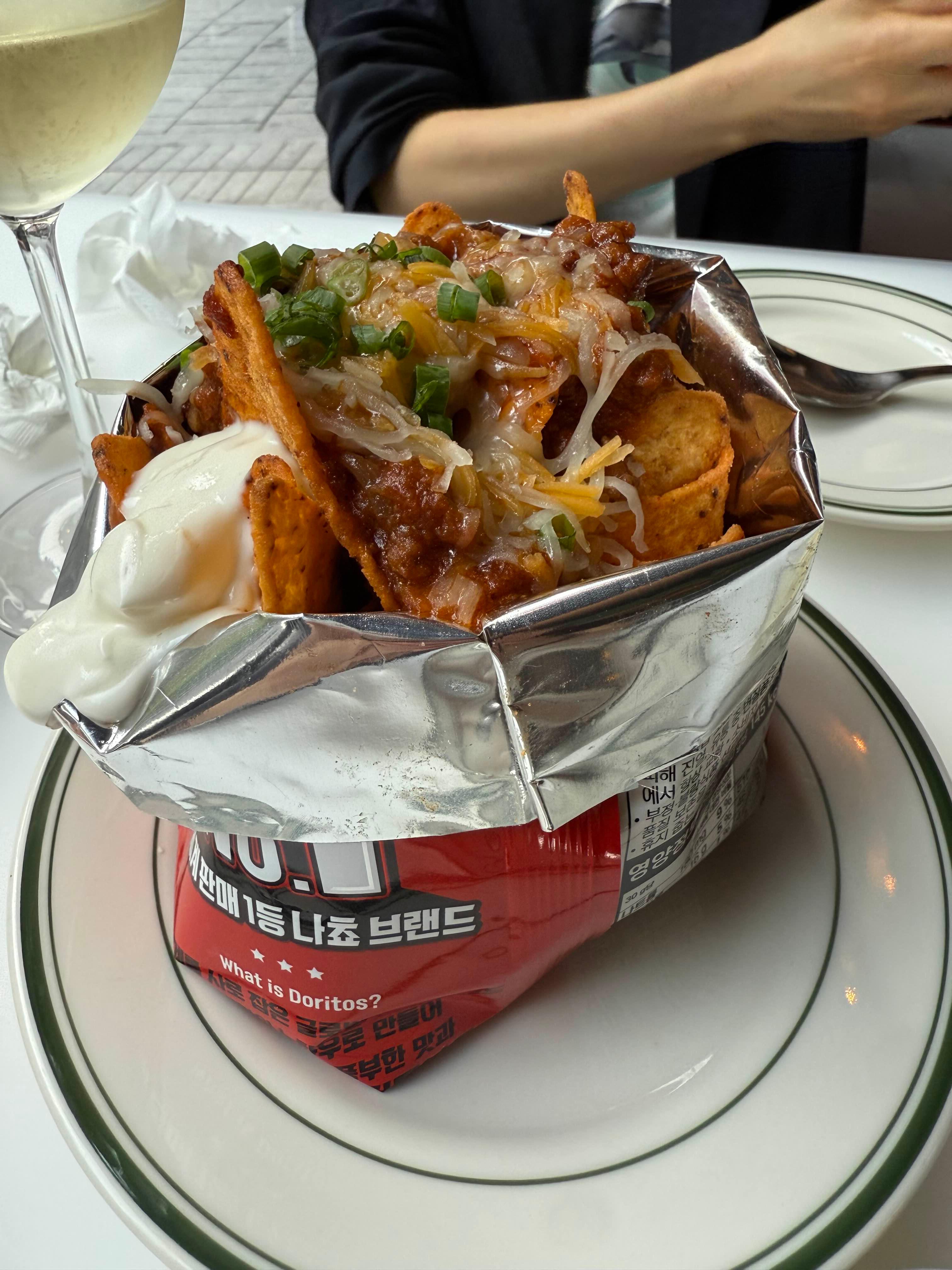 도리토스 봉지를 그대로 활용해 나쵸칩 위에 칠리미트소스, 양파, 사워크림, 치즈를 듬뿍 올린 메뉴.