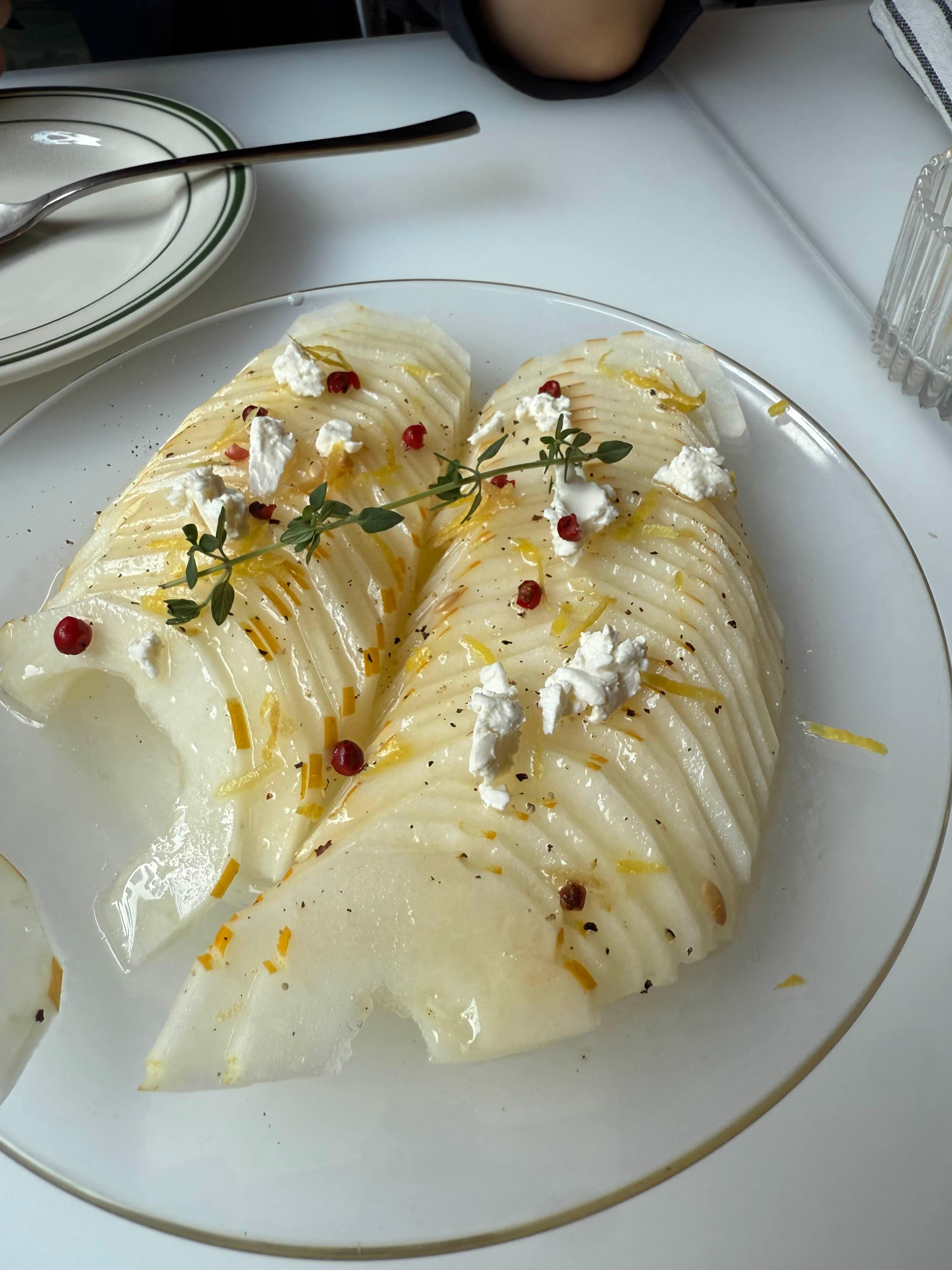 얇게 슬라이스한 참외 위에 상큼한 드레싱과 크림치즈, 핑크페퍼가 곁들여져 달콤하고 청량한 풍미.