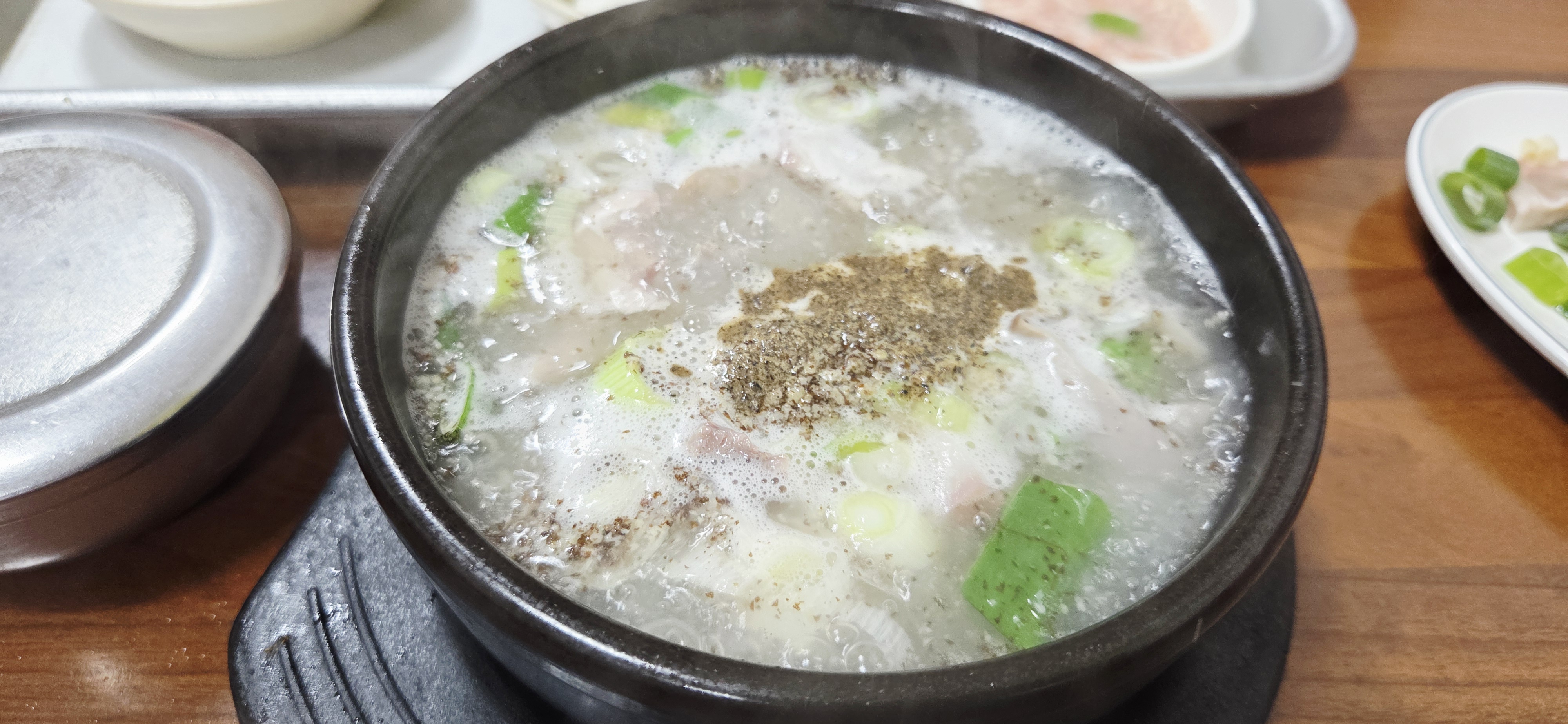 – 뽀얗고 진하게 우러난 국물에 순대, 머릿고기, 내장이 듬뿍 들어있어. 후추 향이 은은하게 올라오고, 파랑 같이 먹으면 국물이 더 개운해져. 새우젓, 부추무침, 김치랑 같이 먹으면 감칠맛이 폭발해.