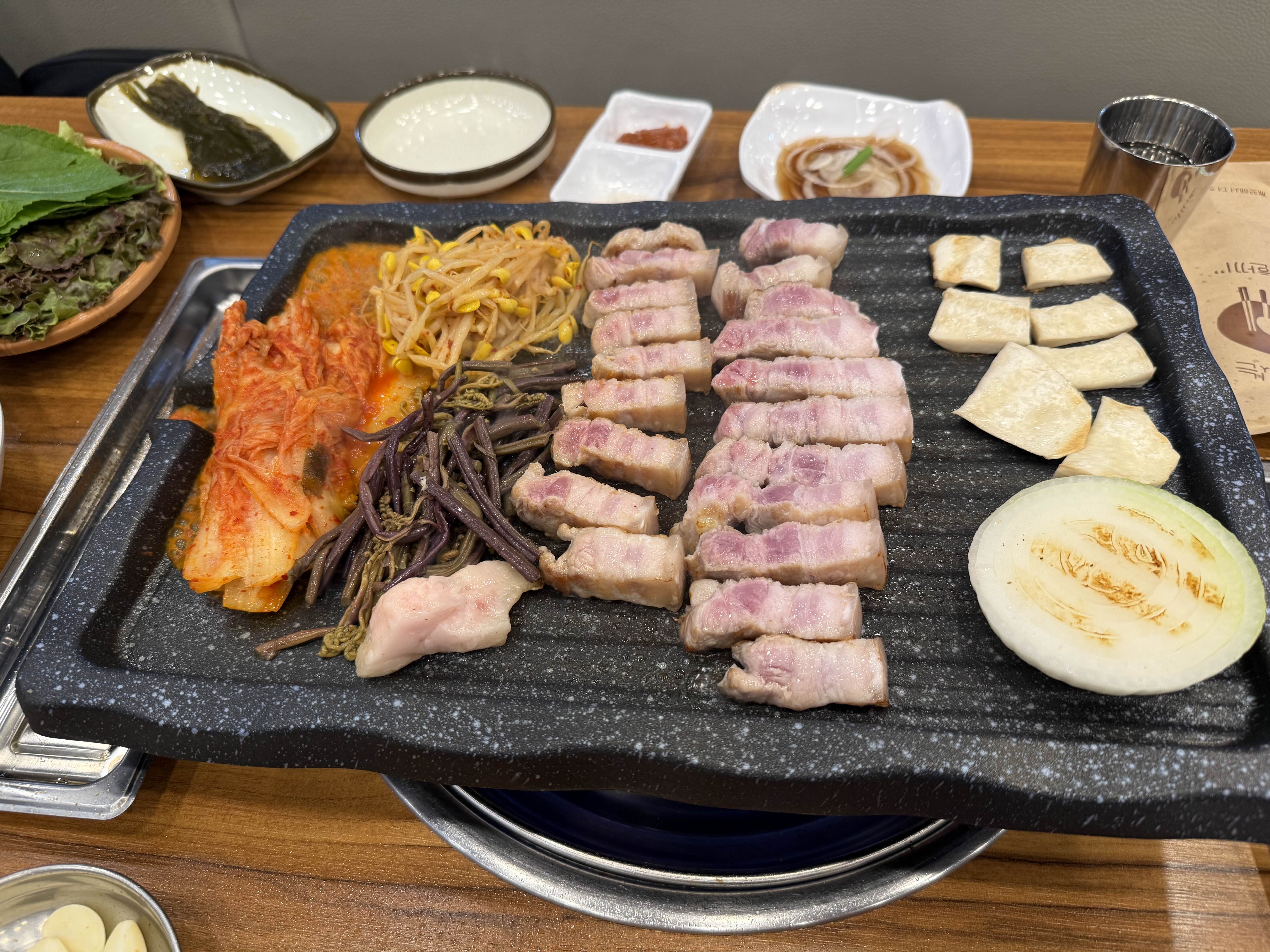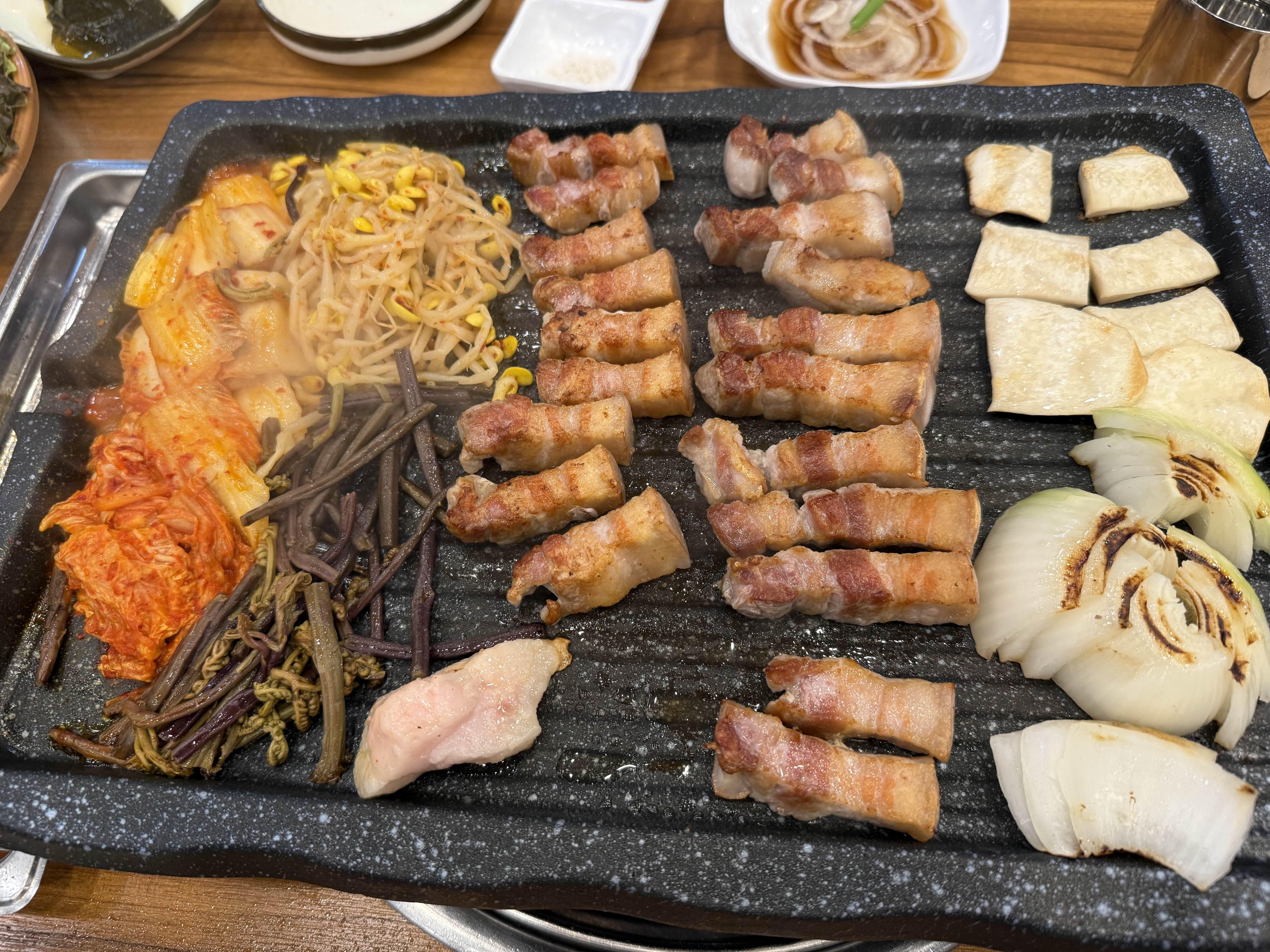 ✔️ 밑반찬 구성: 묵은지, 콩나물무침, 고사리, 양파절임, 마늘, 파채, 쌈채소 등 푸짐하게 제공