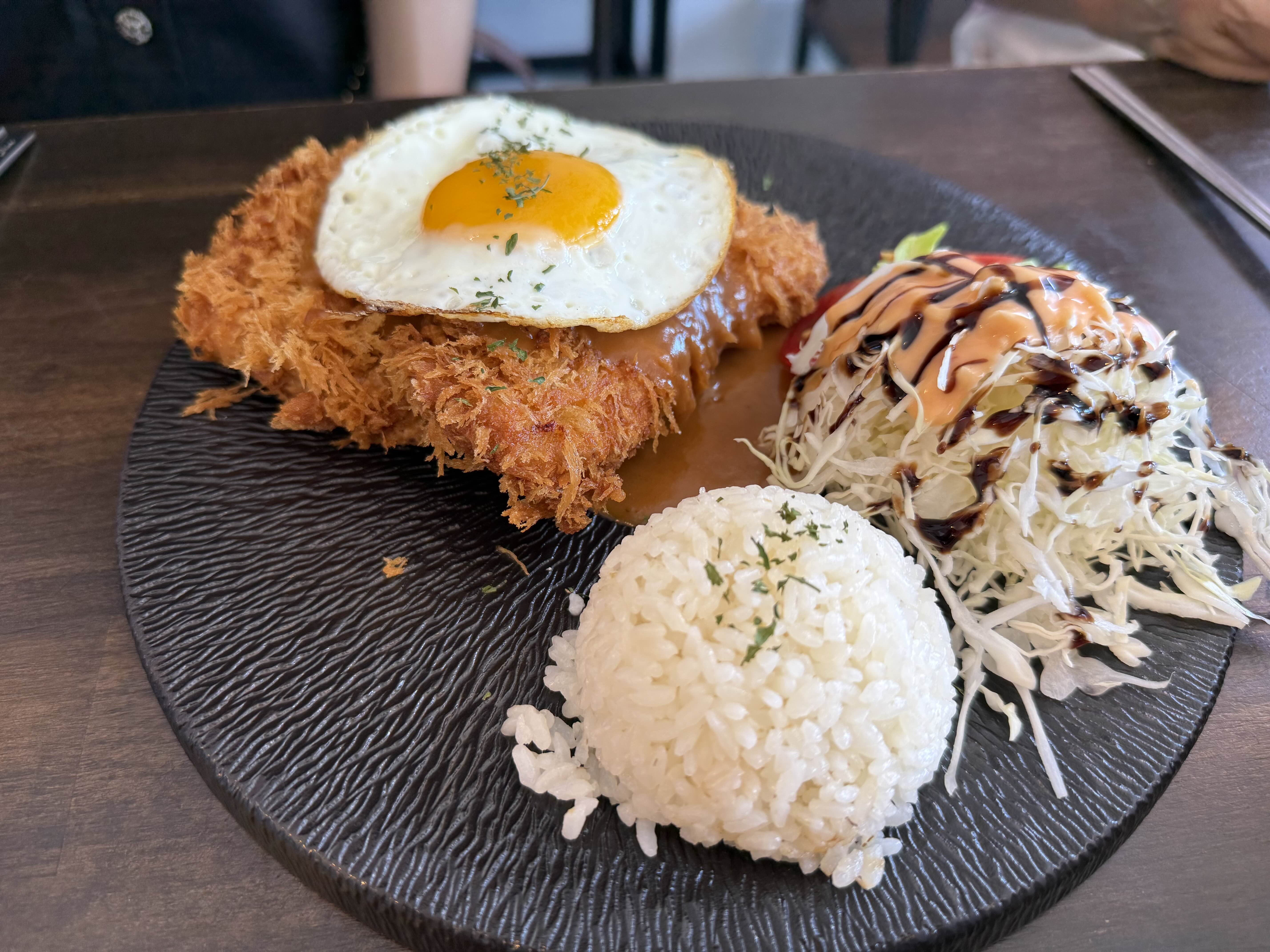 경양식 스타일로 나온 돈카츠. 바삭한 튀김옷과 두툼한 고기, 위에 올라간 반숙 계란 프라이까지 완벽했어. 옆에 나온 양배추 샐러드와 밥까지 정성스럽게 차려져서 퀄리티가 높아 보였어.