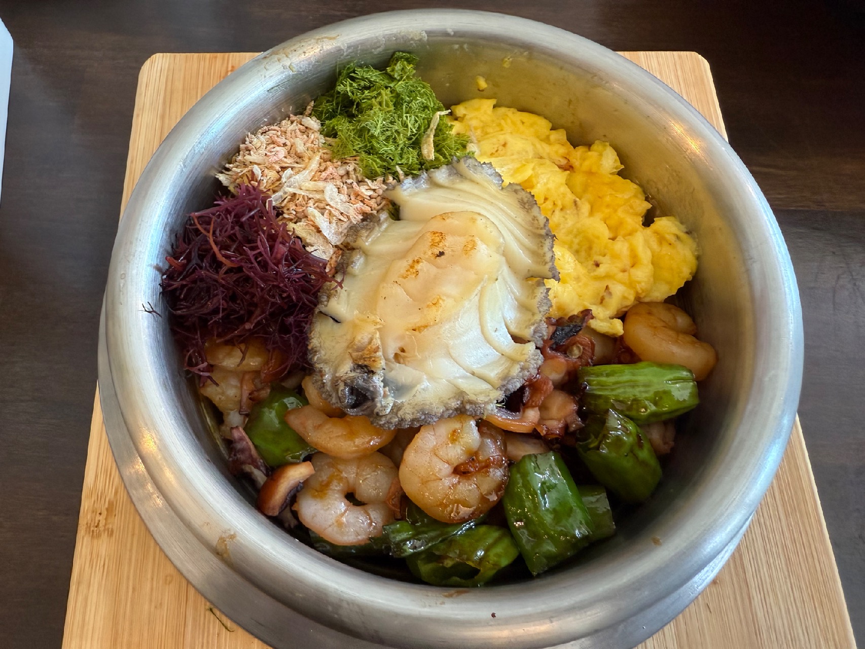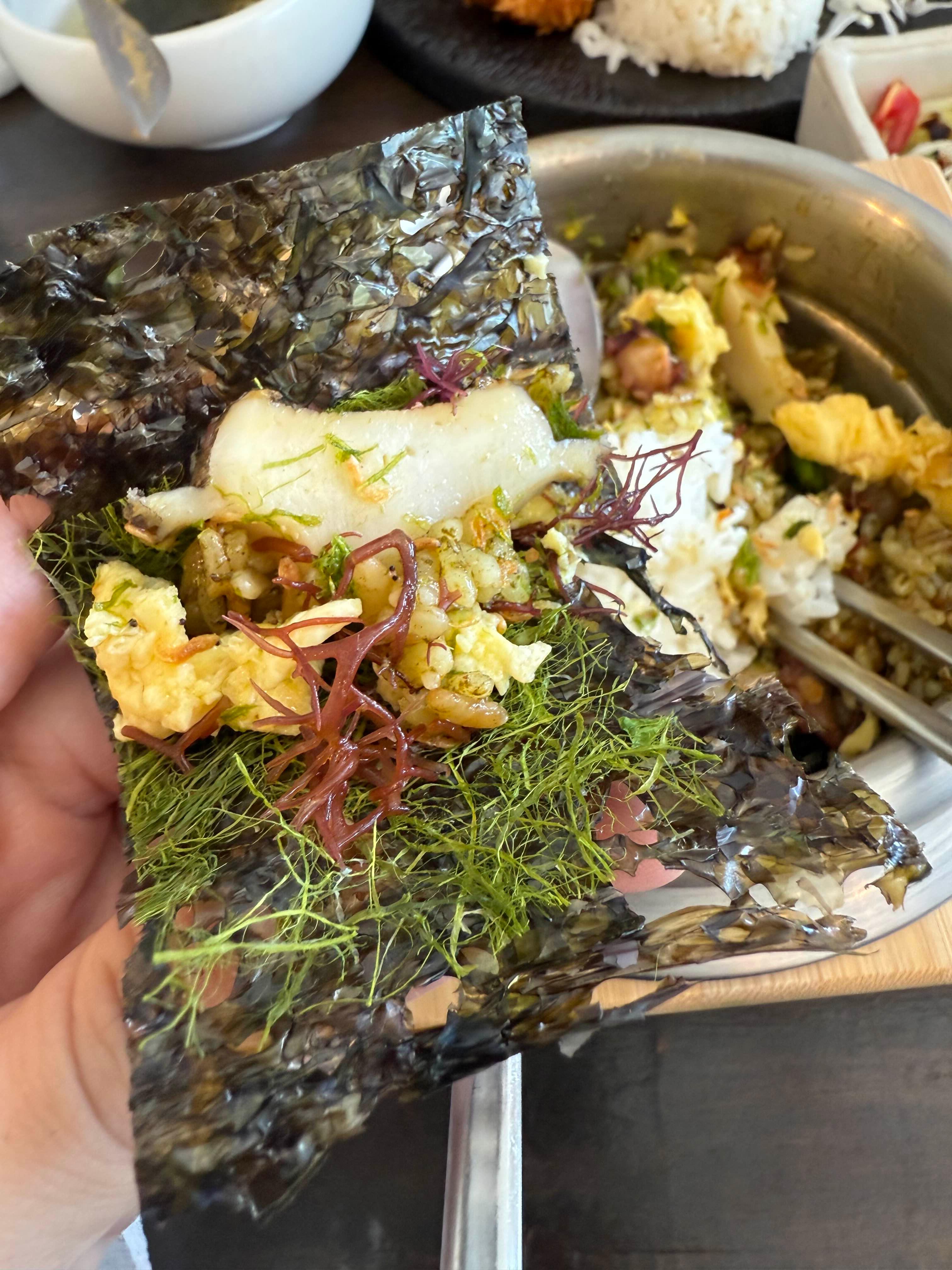 솥밥에 전복 한 마리가 통으로 올라가 있는데, 새우, 해초, 계란이 함께 들어가 있어. 비주얼부터 감탄이 나오고, 김에 싸서 먹으니 바다 향이 그대로 입안에 퍼져. 신선한 해산물 맛이 살아있어서 웨이팅의 이유를 알겠더라.