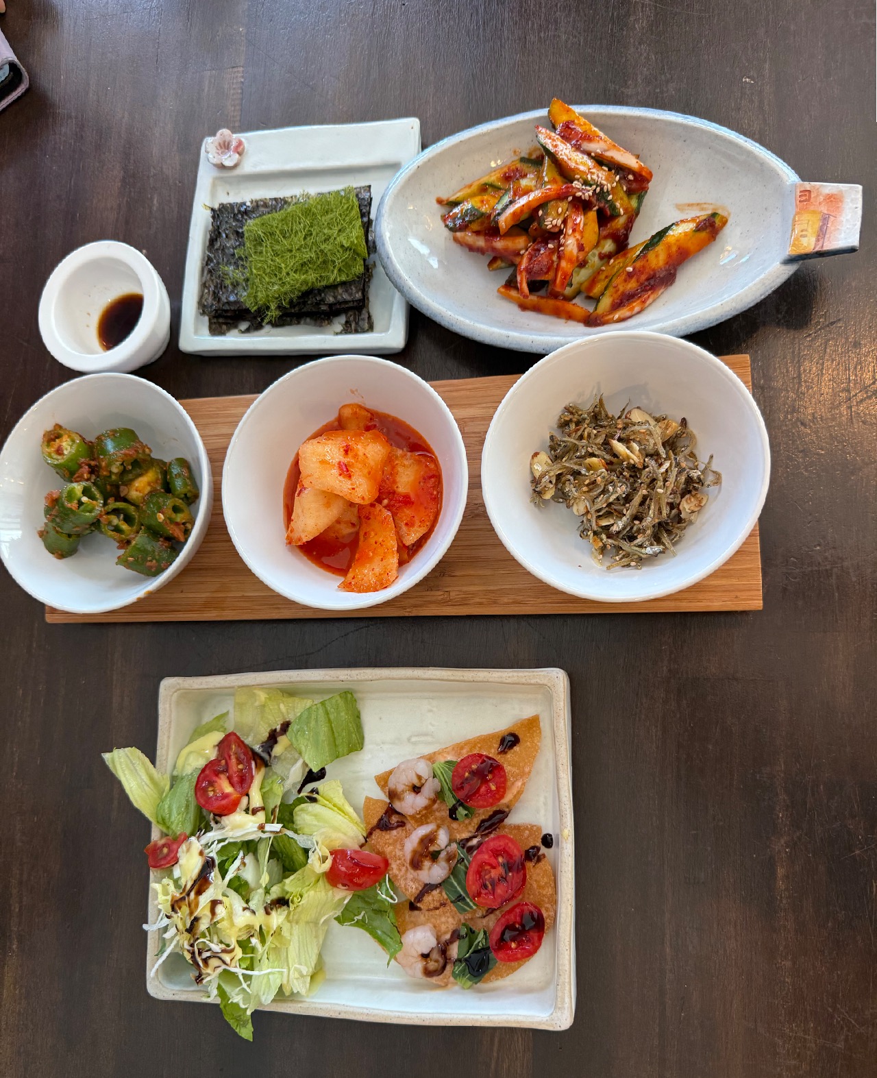 멸치볶음, 열무무침, 오이무침, 깍두기, 고추무침, 김 등 기본 반찬들이 다 맛깔스럽게 준비돼 있었어. 특히 김에 돌솥밥을 싸 먹는 재미가 있었고, 해초와 함께 곁들이니 훨씬 더 바다의 풍미가 살아나더라.