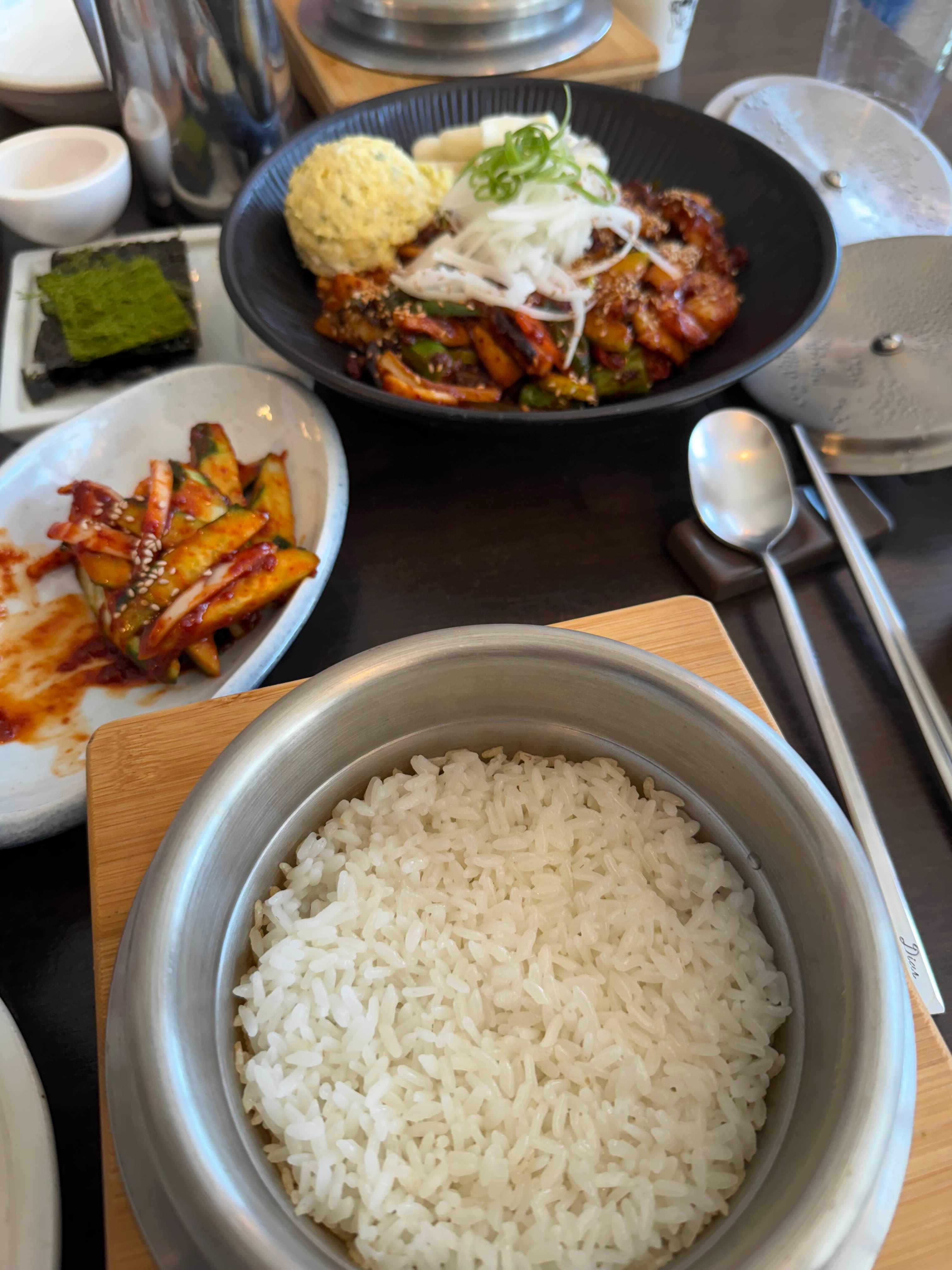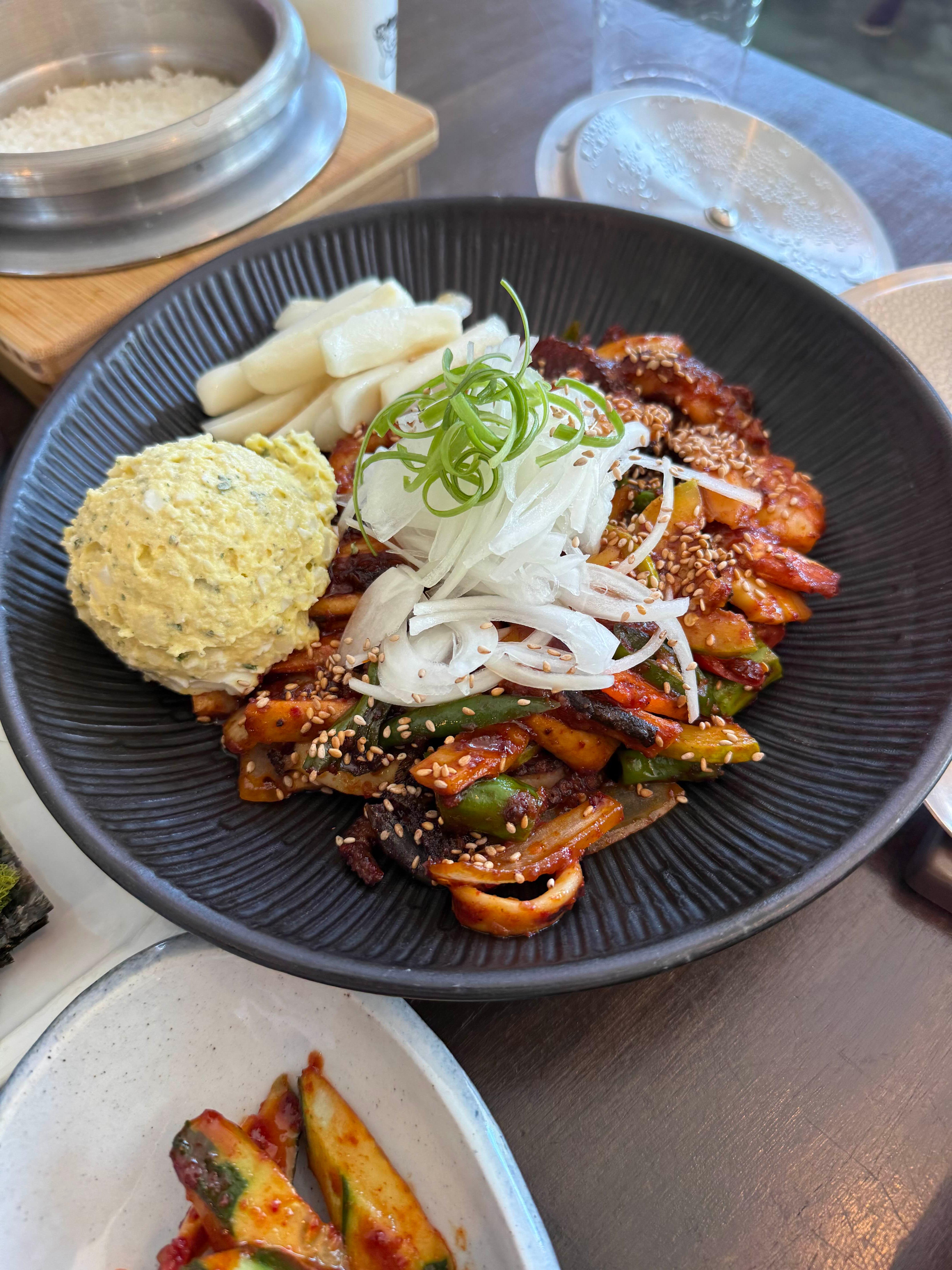 메인으로 시킨 메뉴. 매콤하게 볶아낸 문어와 전복, 새우가 정말 푸짐하게 들어있어. 그 위에 올려진 달걀 샐러드와 아삭한 양파까지 함께 먹으면 매운맛이 부드럽게 조절돼. 돌솥밥이랑 같이 먹으니 진짜 환상 조합!