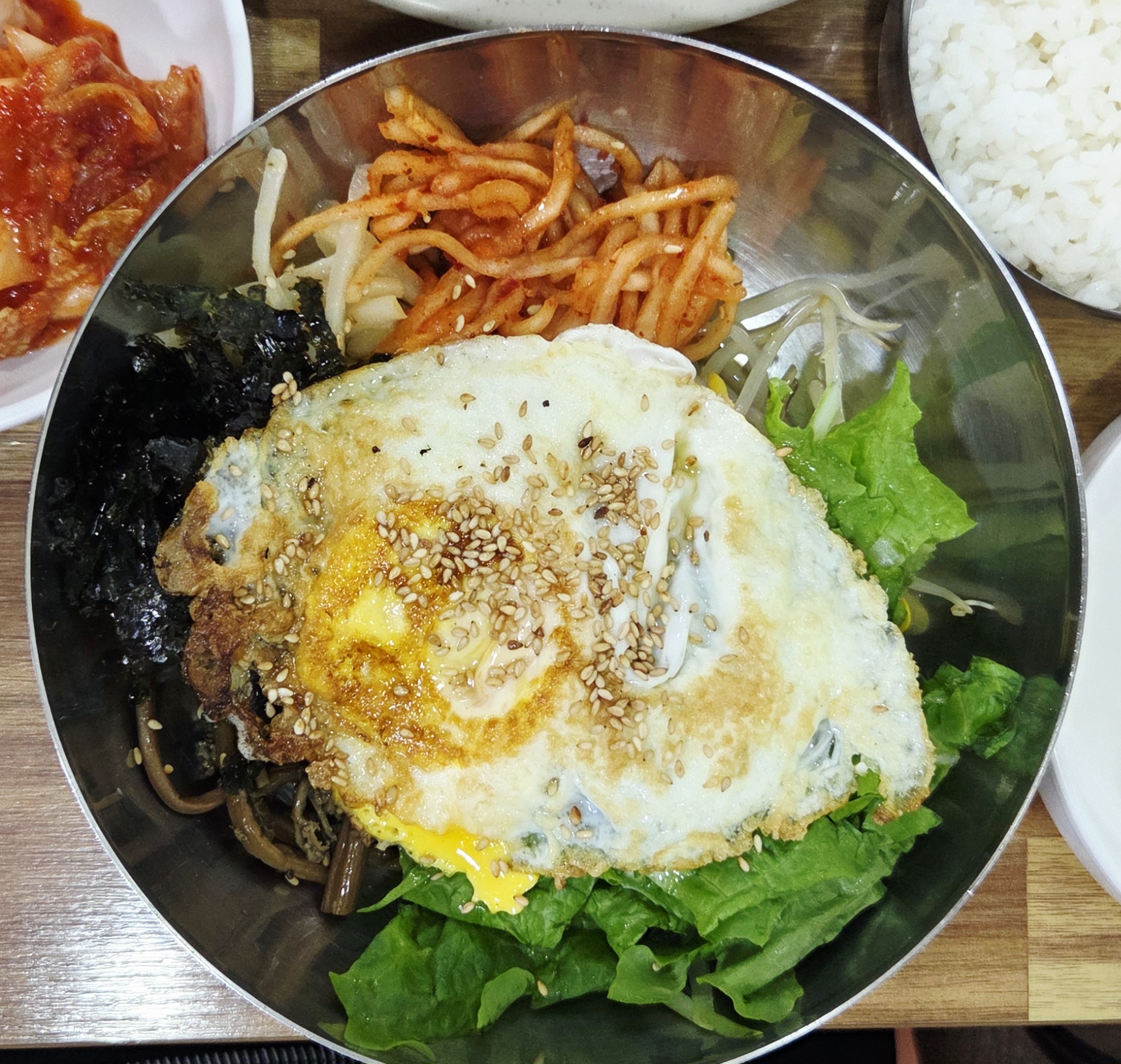 ✔ 비빔밥 (8,000원) – 신선한 채소와 고소한 김, 잘 구운 계란 프라이가 올라간 비빔밥. 참기름 향이 솔솔 나고, 양념장과 비벼 먹으면 딱 집밥 느낌!