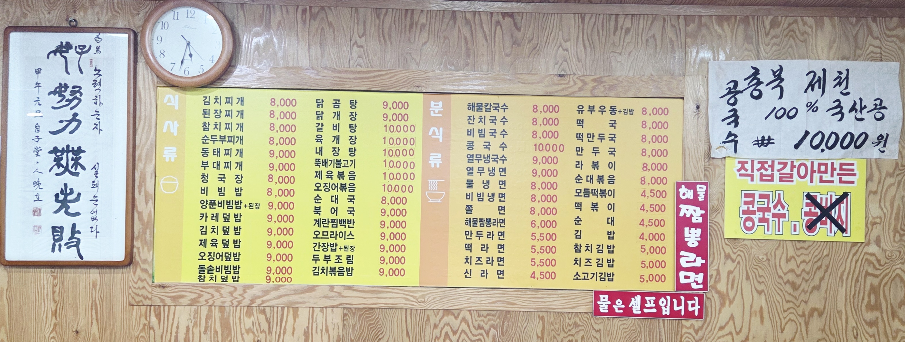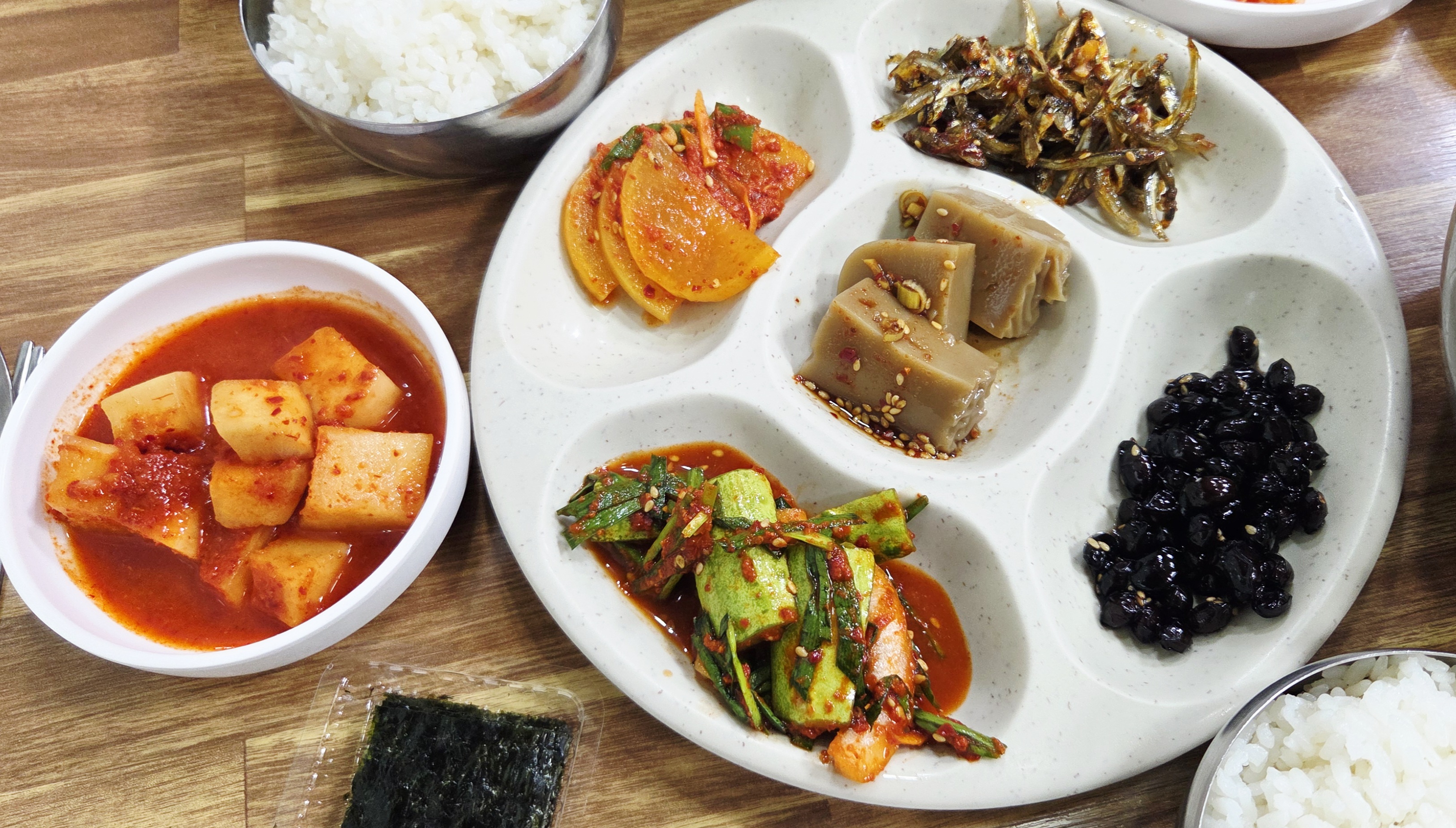 ✔ 밑반찬 – 김치, 깍두기, 도토리묵, 멸치볶음, 콩자반, 김,오이무침 등 정성 가득한 한식 반찬이 가득. 반찬 리필도 가능해서 푸짐하게 즐길 수 있음.