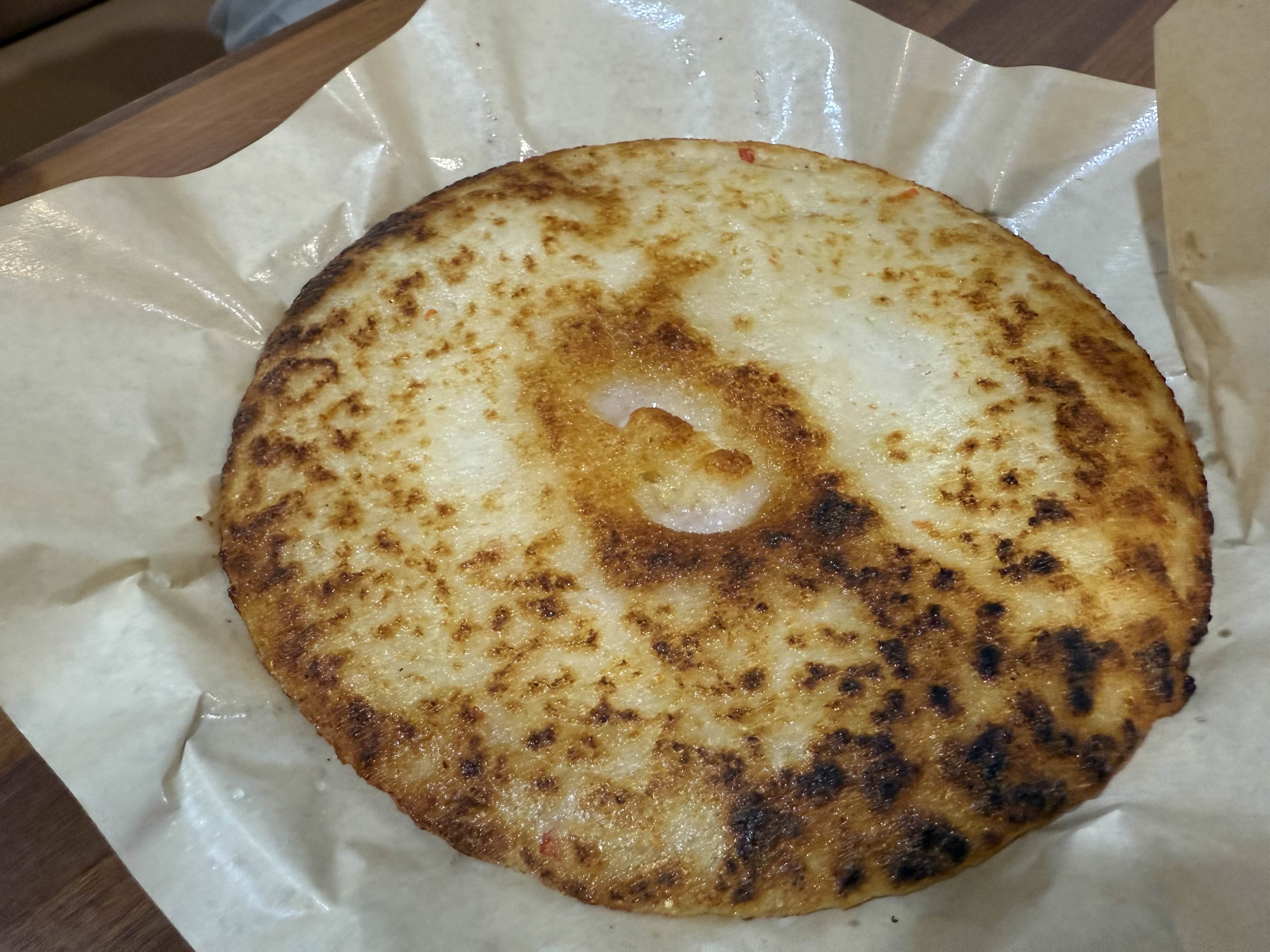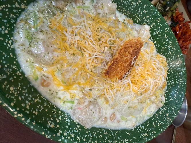부드러운 크림소스와 옹심이의 신선한 조합. 서양식 크림파스타 같지만, 바닥엔 감자전 조각이 깔려 있어 별미! 치즈가 듬뿍 얹어져 고소함 폭발.