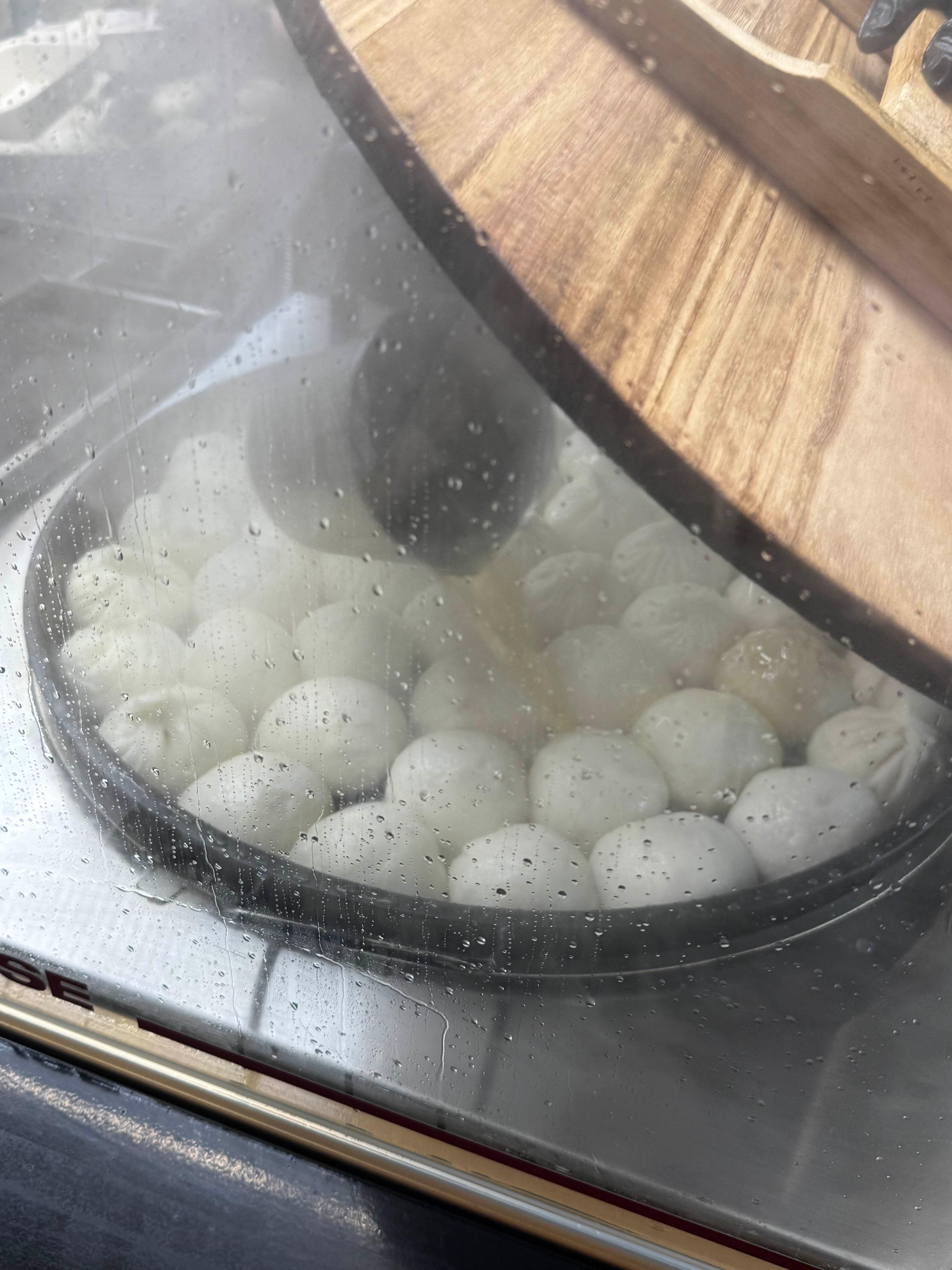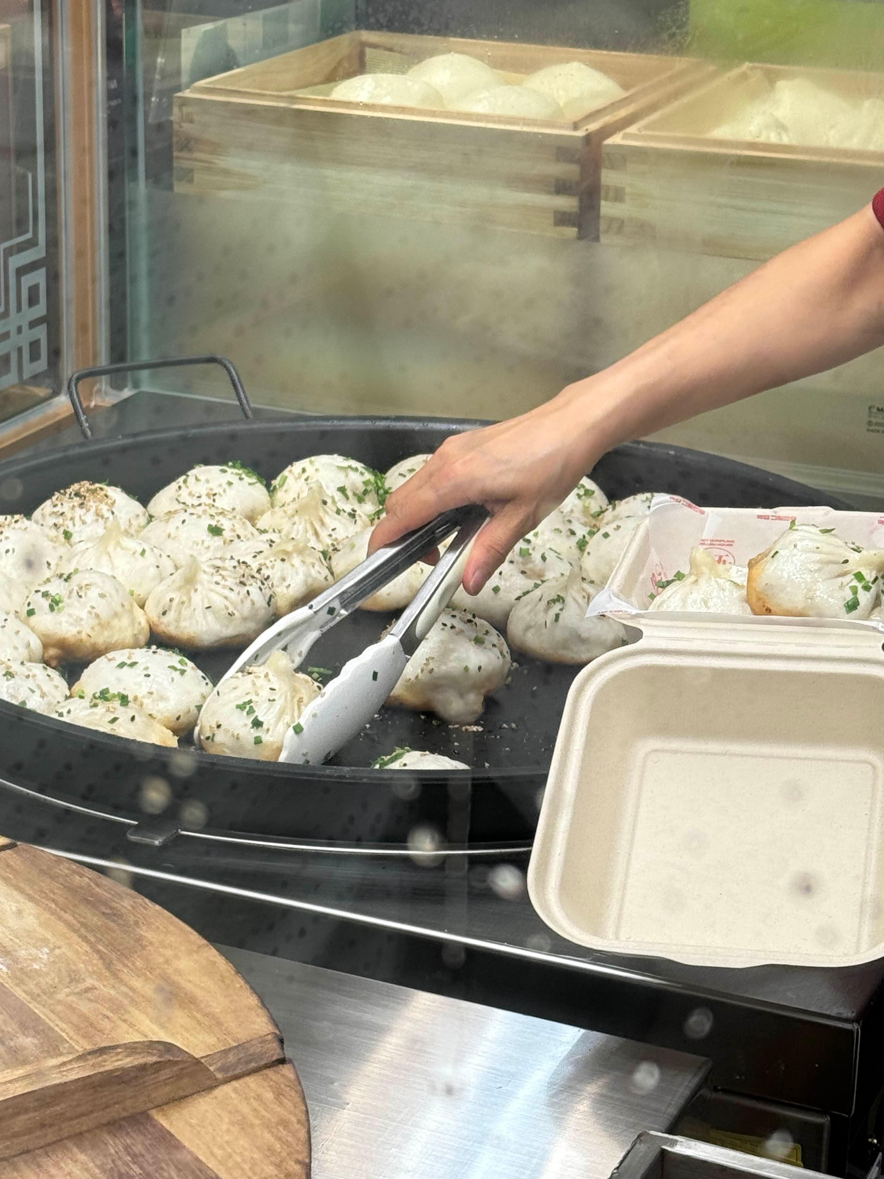 매장은 블랙 앤 골드 톤 간판에 고급스러운 느낌을 주는데, 줄 서 있는 사람들 보니까 인기가 실감나더라구. 오픈 주방이라 만두가 쪄지고 굽히는 과정을 바로 볼 수 있어서 기다리는 동안 구경하는 재미도 있었어. 특히 커다란 철판 위에서 만두들이 바삭하게 구워지는 장면은 군침이 절로 나옴.