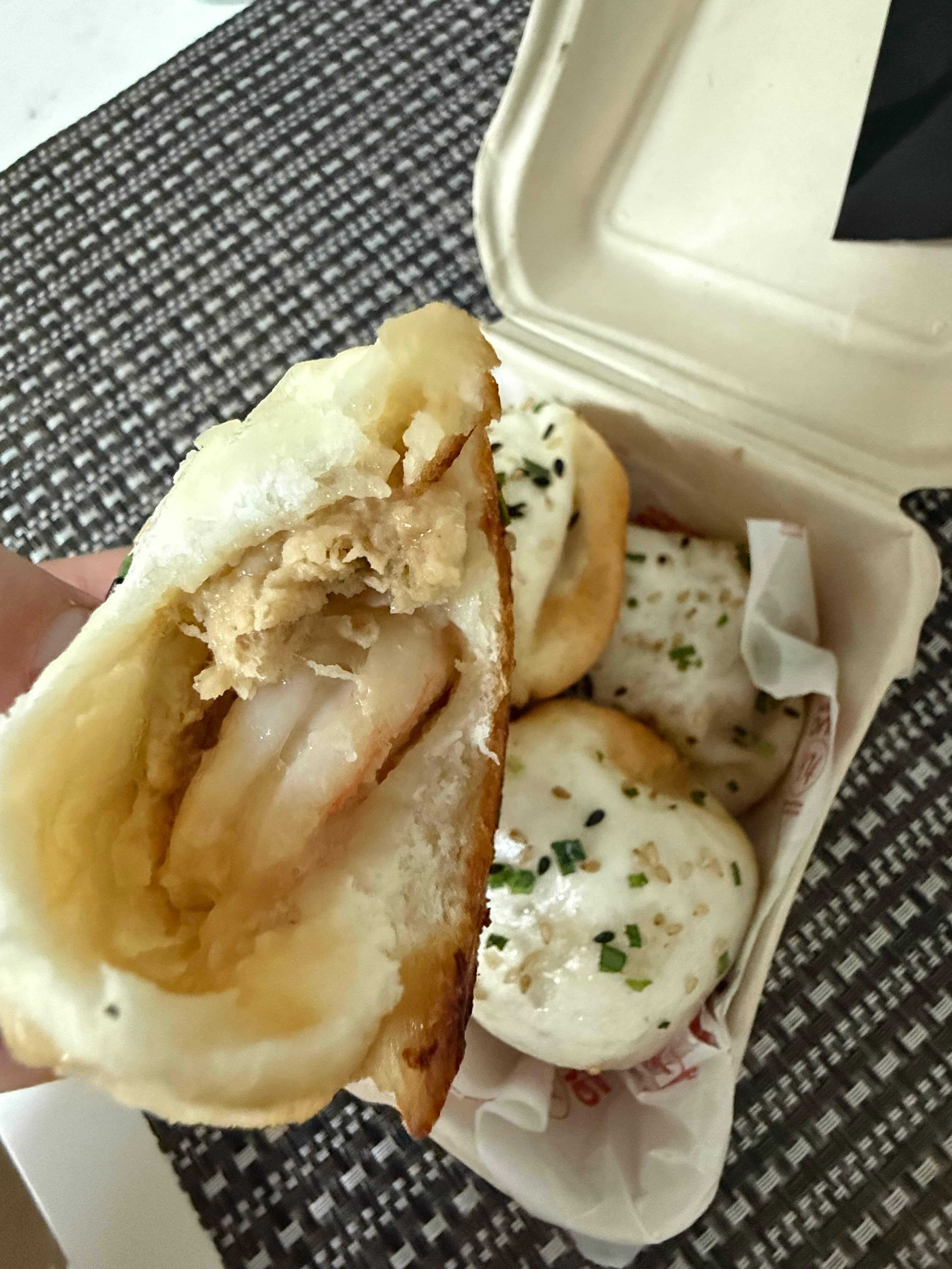 박스 열자마자 고소한 깨와 쪽파 향이 확 올라와. 겉은 바닥이 노릇노릇 바삭하고, 윗부분은 촉촉한 질감이라 두 가지 식감을 동시에 즐길 수 있어. 한입 베어 물면 뜨끈한 육즙이 터지는데, 안에 통통한 새우가 들어 있어서 씹는 맛이 진짜 살아있어. 흔히 먹는 군만두랑은 확실히 다른 느낌이야.