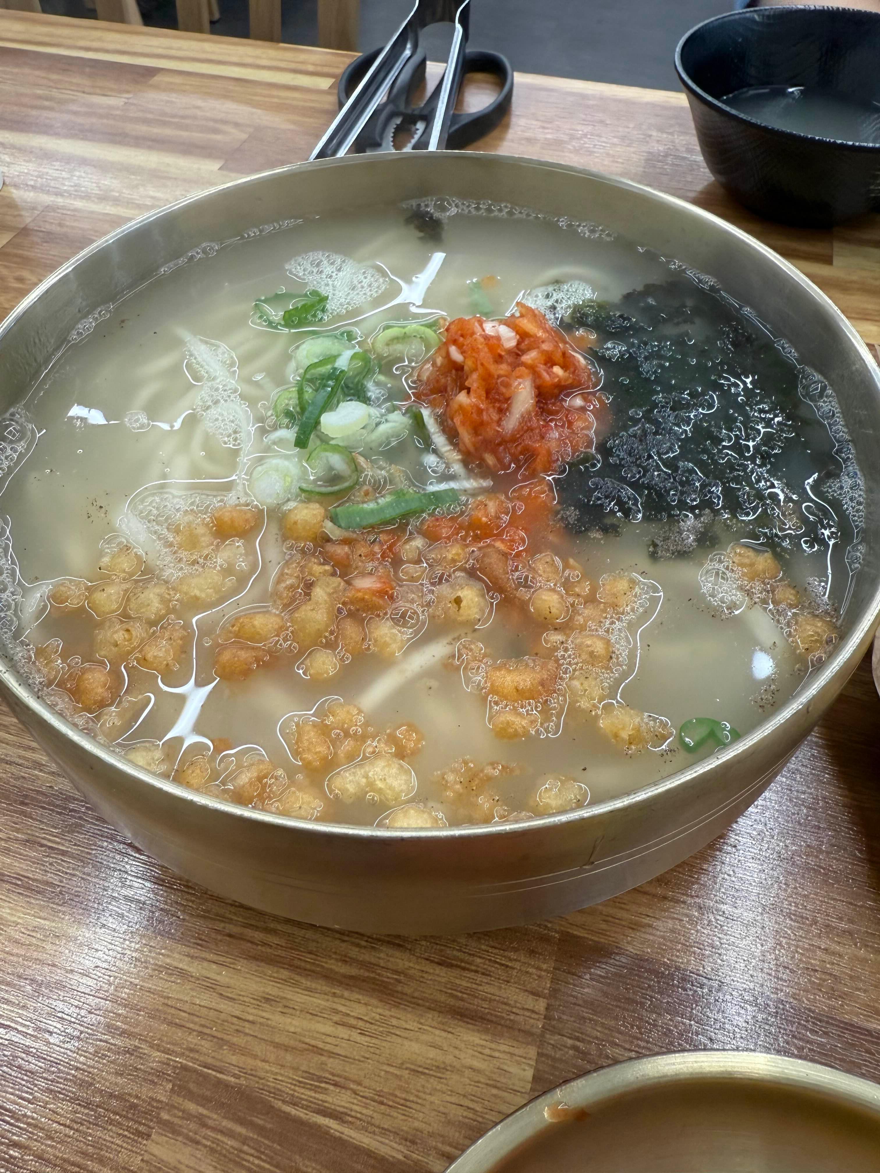 멸치 육수 베이스라 국물이 시원하고 담백해. 위에는 김가루, 파, 김치 고명이 올라가서 국물 맛이 한층 깊어졌어. 바삭한 새우튀김 맛돌이까지 함께 먹으니 씹는 재미가 추가돼.