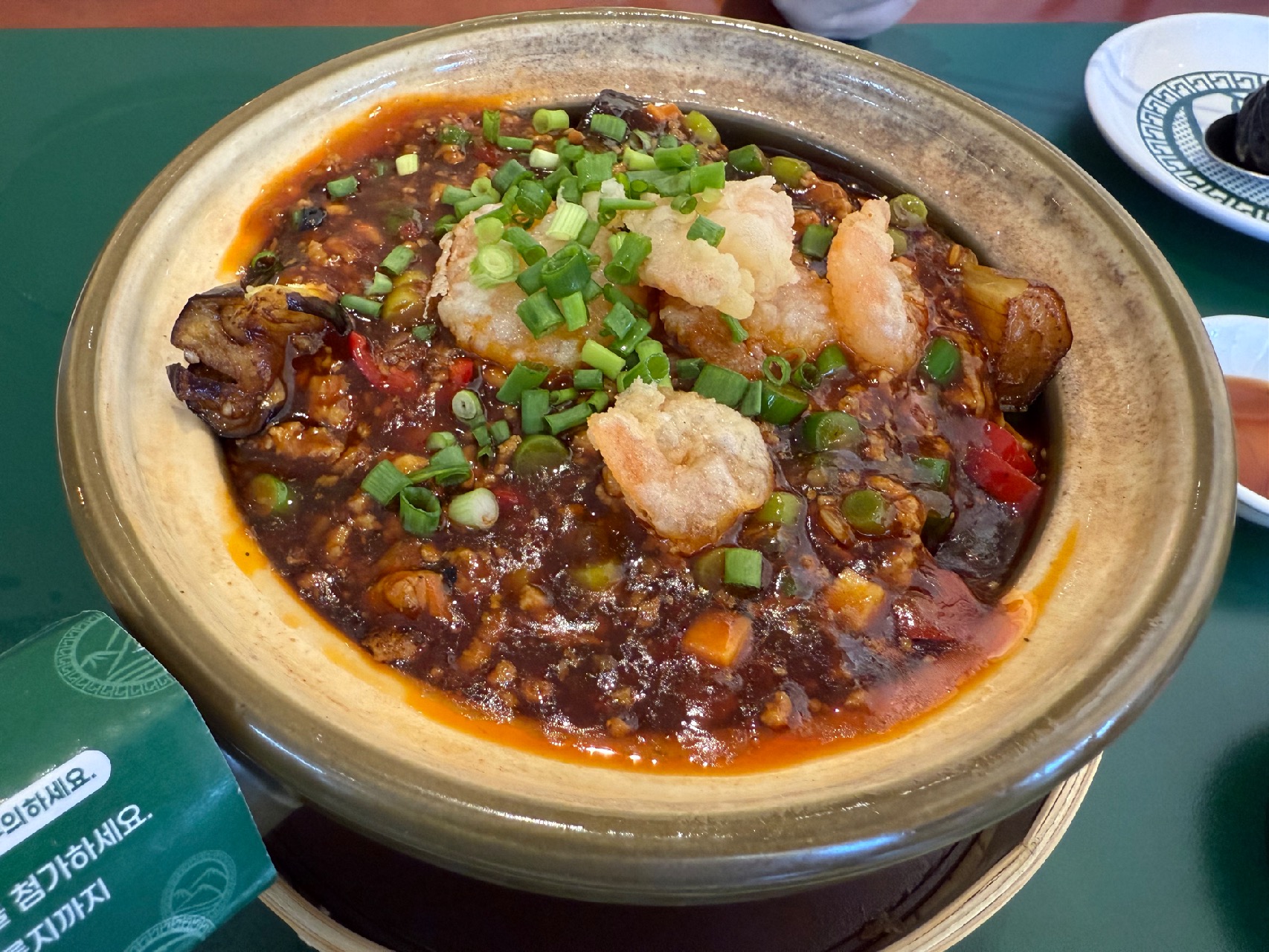 바닥은 고소하게 눌어붙은 밥, 위에는 짭짤달큰한 마파소스 스타일의 가지조림과 새우튀김이 올려져 있어요. 소스와 밥을 골고루 비벼 먹으면 중독적인 맛!