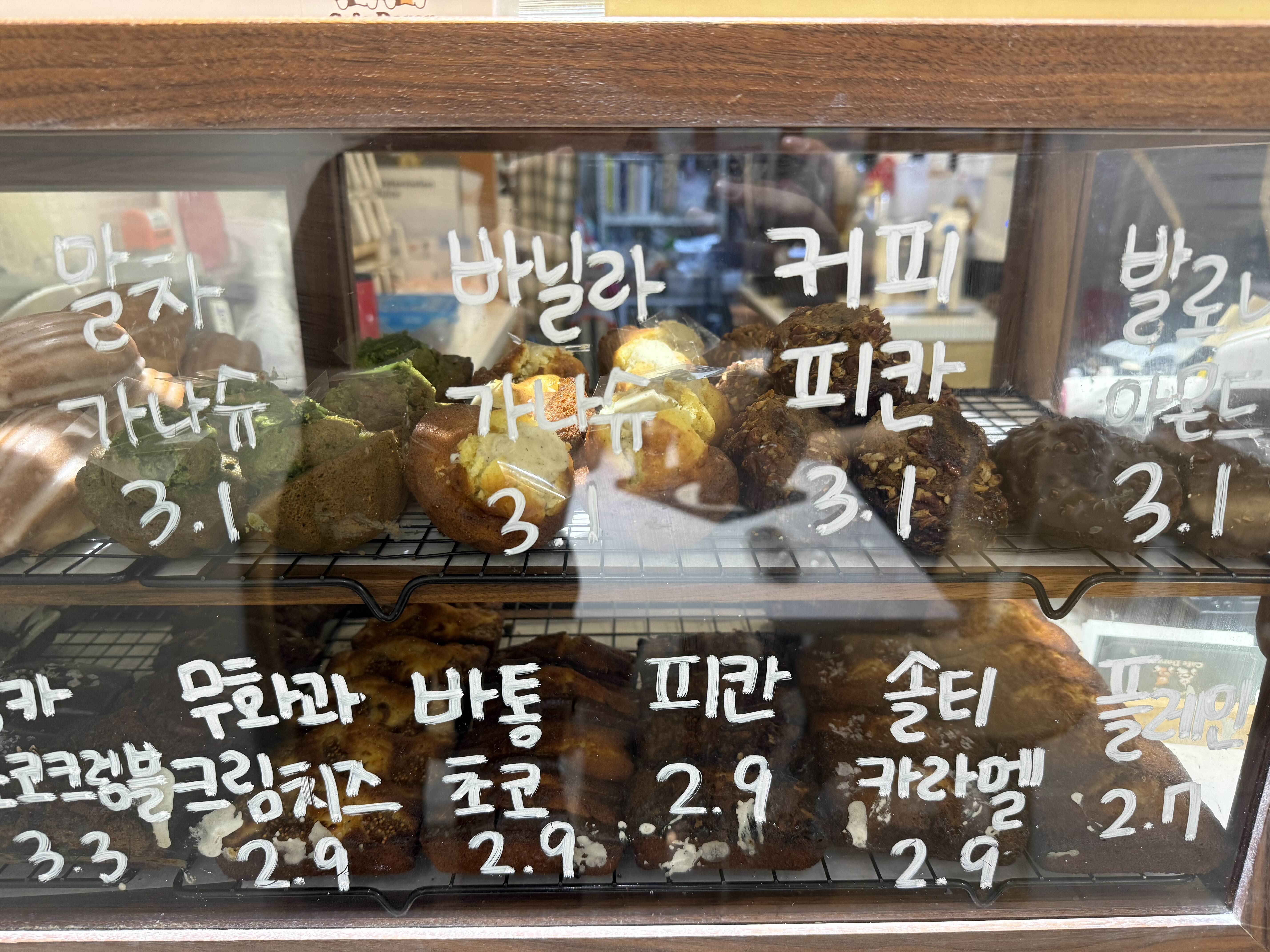 ✔️ 커피 피칸 (3.1) – 고소한 피칸이 잔뜩 올라간 휘낭시에. 겉은 바삭, 속은 촉촉해서 커피랑 완벽 조합.