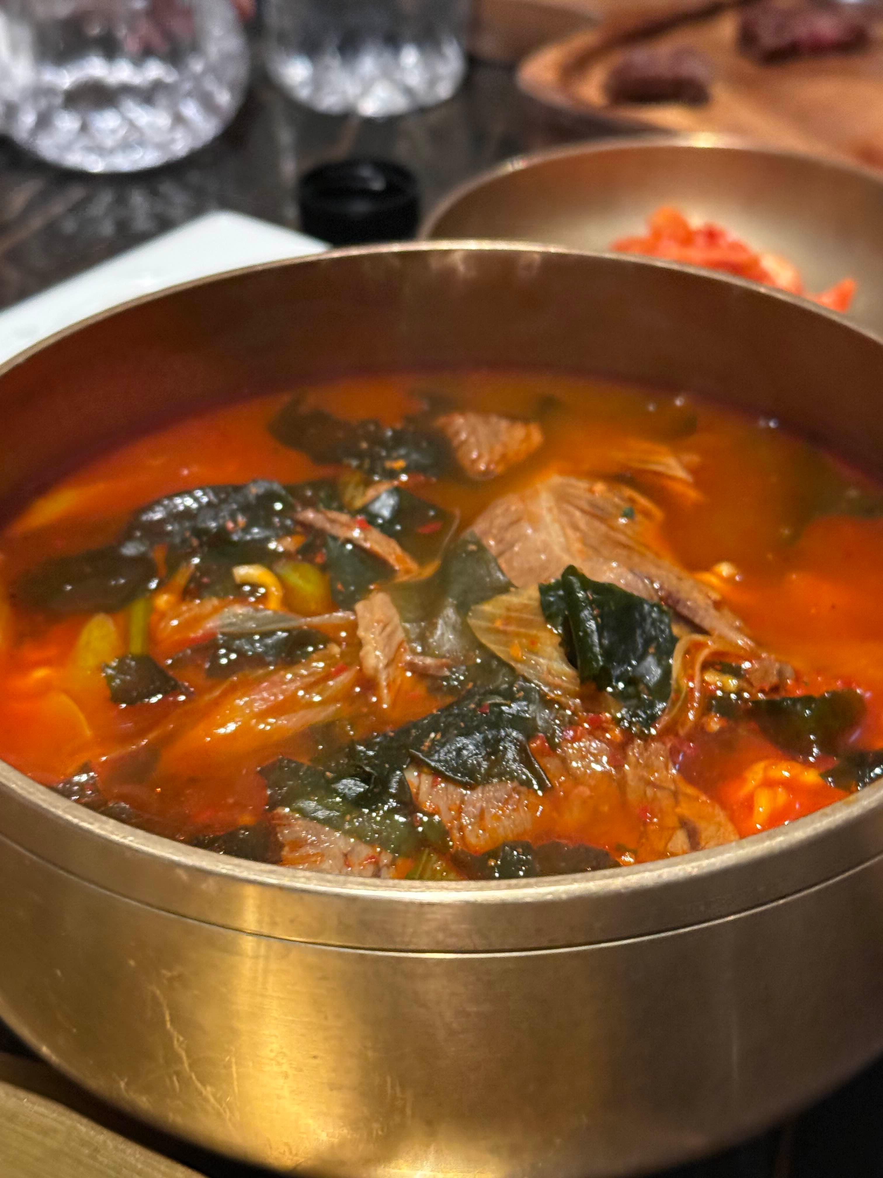 진한 육수에 푸짐한 고기, 야채가 들어간 속풀기용 매콤 국물. BBQ 마무리용으로 최고.