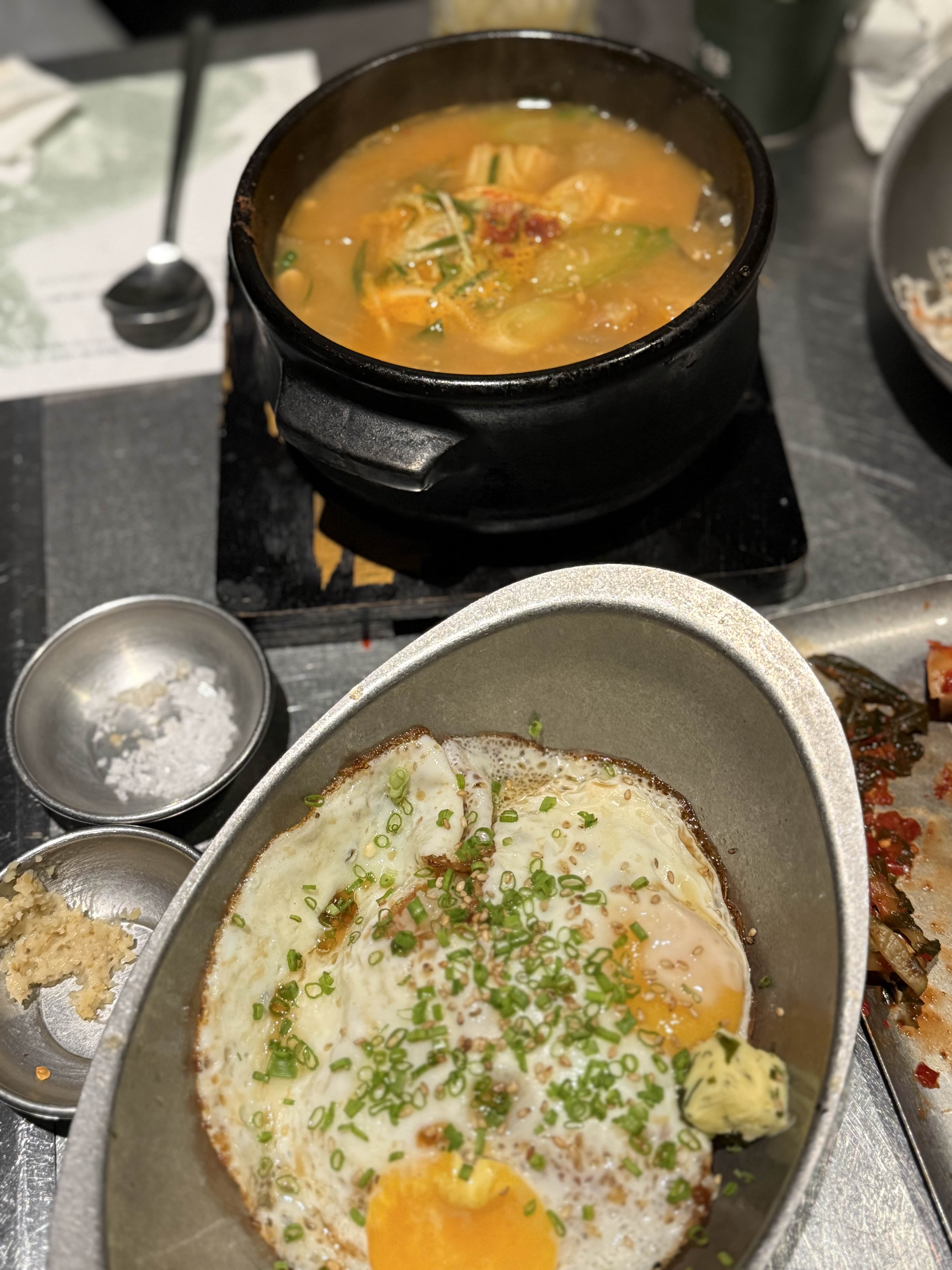숙성 돼지고기와 된장찌개, 그리고 간장계란밥까지.