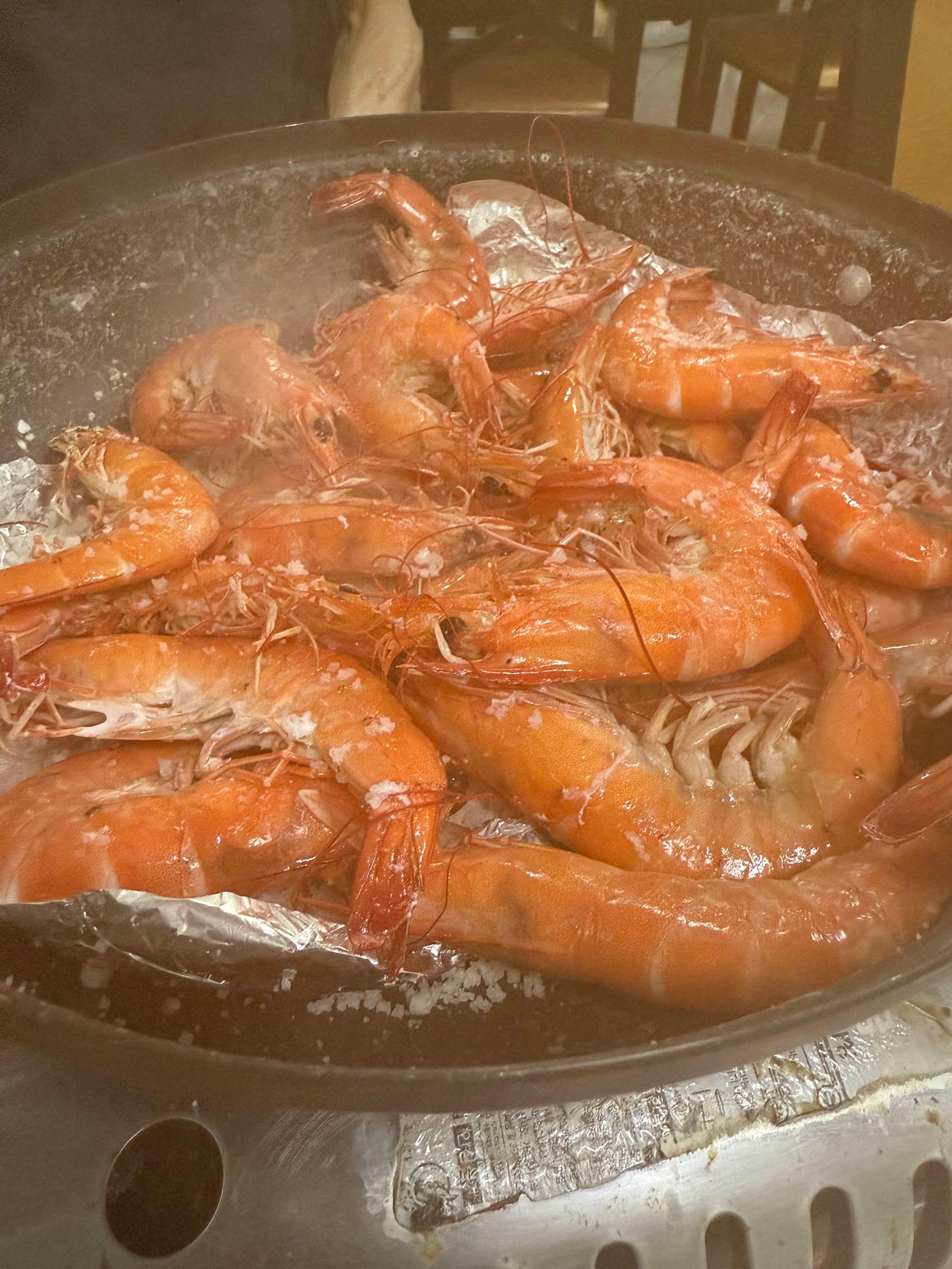 커다란 왕새우를 소금 위에 올려 구워서 담백하면서도 짭짤한 풍미가 입안 가득 퍼져. 껍질 까는 재미와 탱탱한 식감까지 완벽했어.