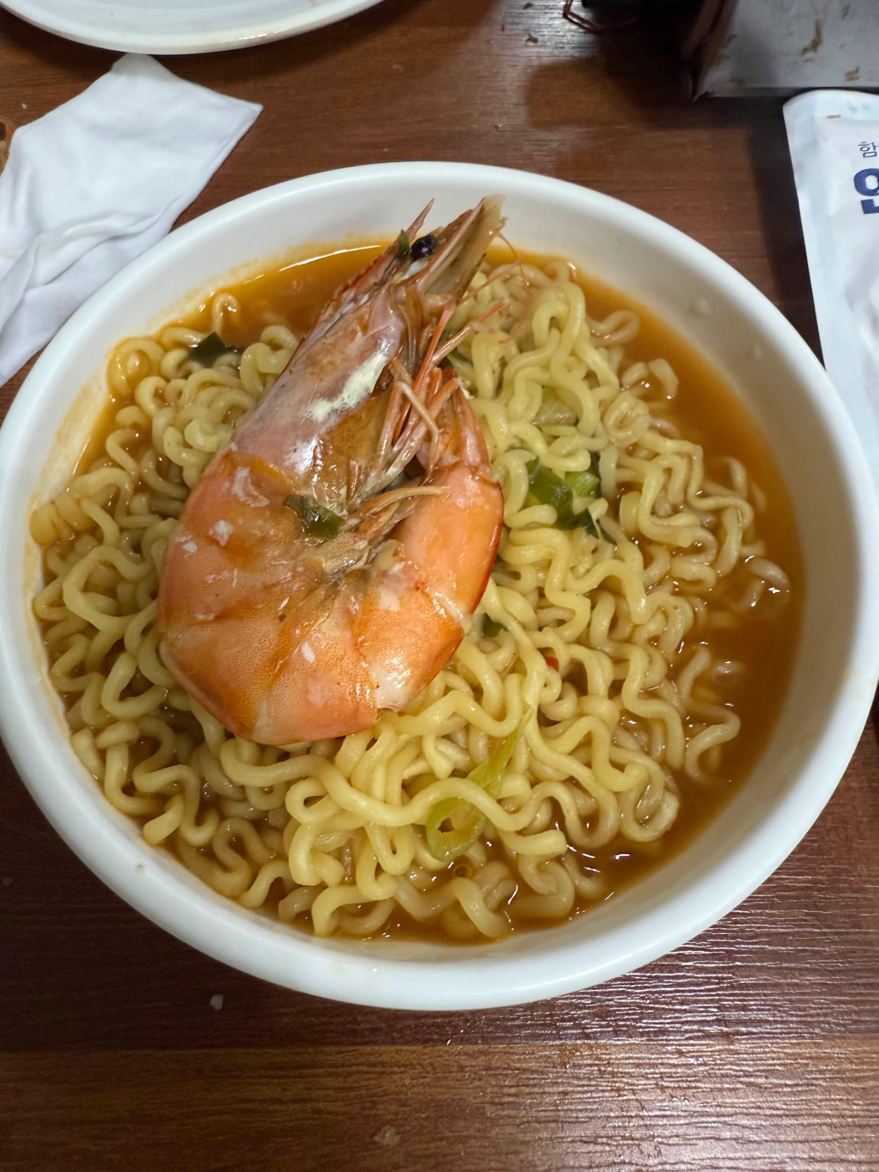 마무리는 역시 라면이지. 국물에 새우 향이 배어 있어서 평범한 라면이랑은 차원이 달라. 국물 한 숟갈에 하루 피로가 싹 풀렸어.